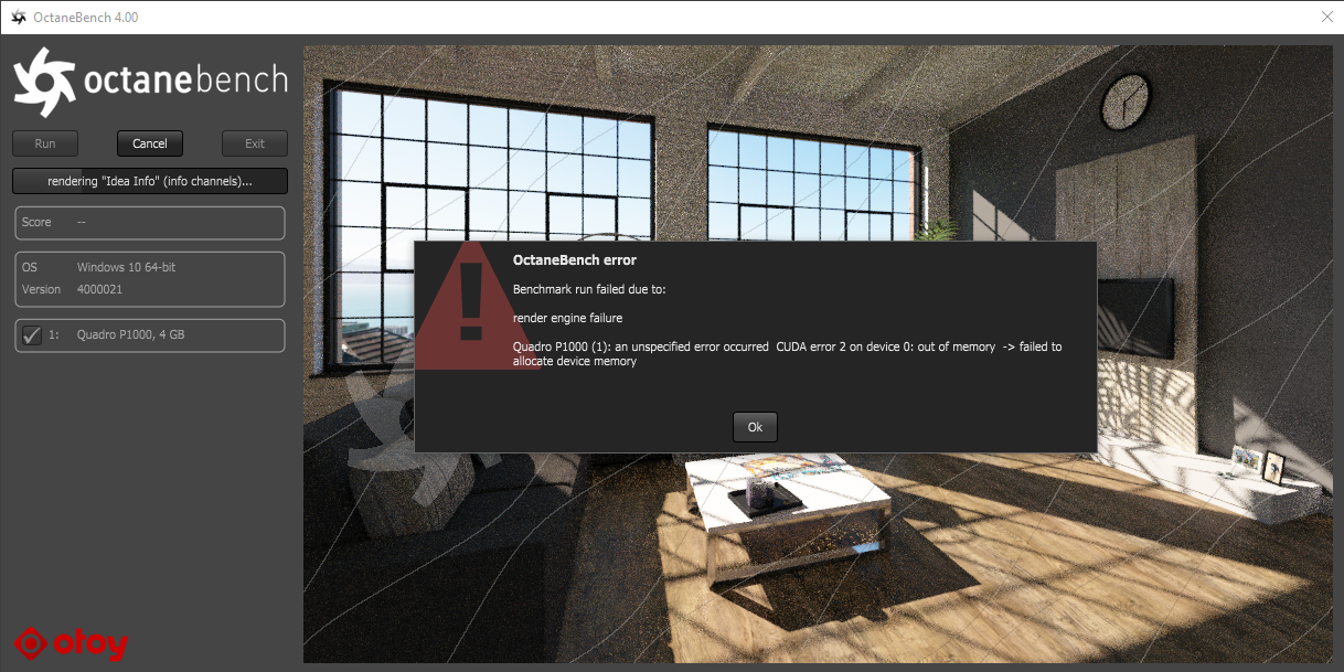 I'm using 4.01, and it seems I can't run OctaneBench, either. It says failed to allocate device memory. Not sure how to fix this. Thx!