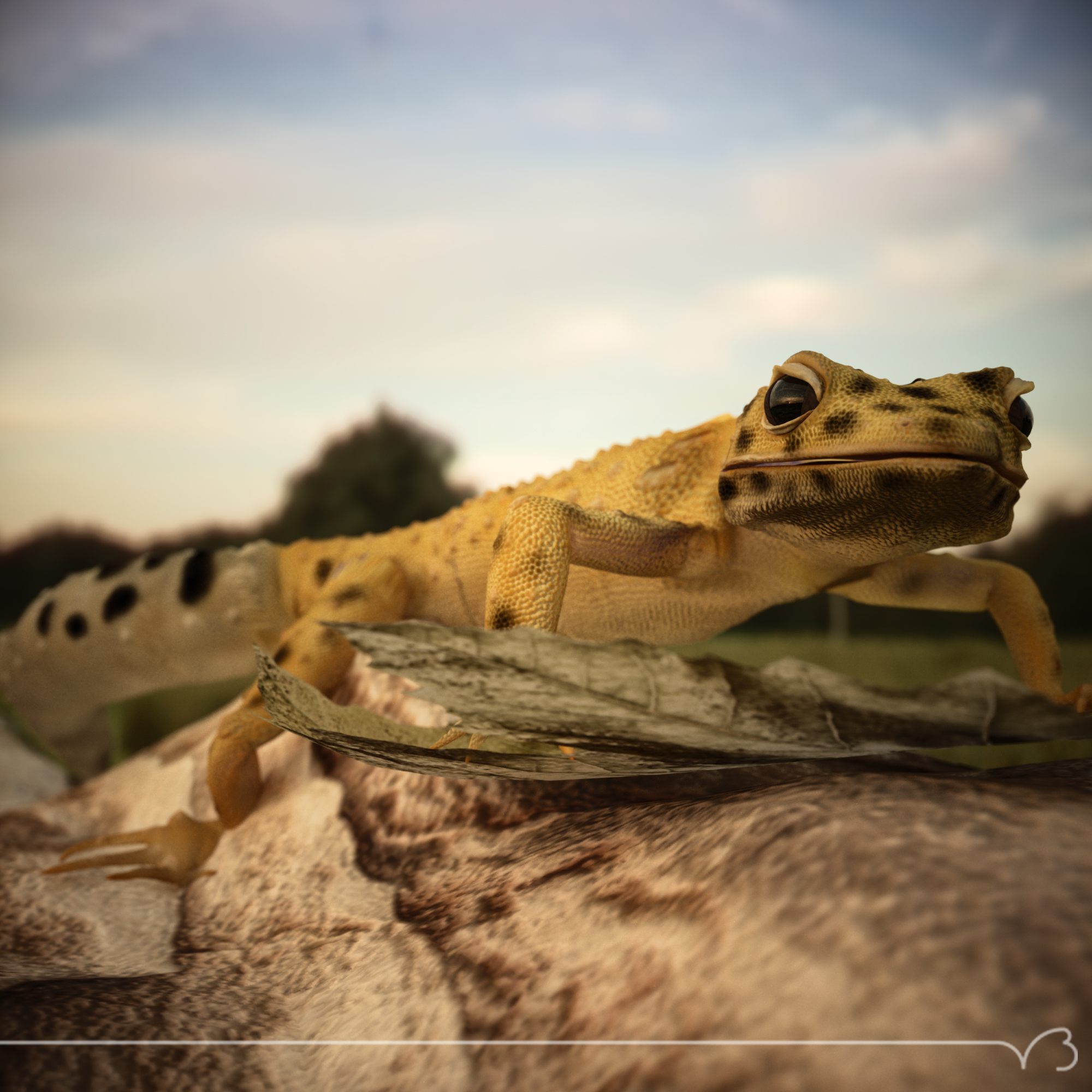 Well, after I finished (more or less, I've got an animation planned) the firefly, I thought of something else to model using sub-modeling. I've always loved lizards so I went out to the net to hunt down some reference pictures, there I stumbled with several leopard geckos and I thought they would be a good subject. The low poly base mesh turn out fine, but adding those bumpy scales with that technique turned out a little bit faked, so I put it on sculptris and added the extra details and took some stiffness out of it. Also in sculptris hand painted the color, normal, and masks maps. Then I used the lowpoly one as base for uv-ing and morphing. Did a custom rig, and played a lot with the materials in Octane to get a kind of SSS look mixing specular and diffuse materials thru some hand painted masks. When I got all balanced I felt it needed some enviroment, so I modeled a quick rock using a photo reference from cgtextures and added a couple leaves and some grass clips in the background.