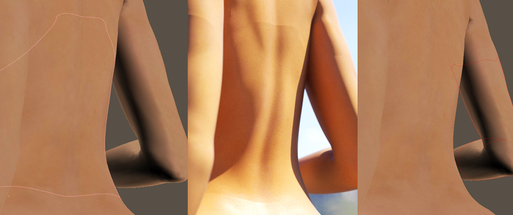 The creases are definitely along the body part borders... Not the material borders, but the body part borders. You can see in the attached file where I compare a Poser real-time screencap with the abdomen highlighted, with an Octane area render of the same area. The images aren't perfectly aligned or scaled, but you can clearly see the shape of the abdomen reflected in the creases on the Octane render.