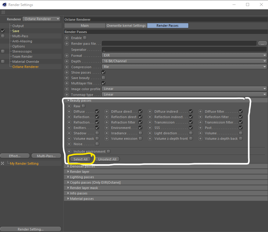 The 'Select All' button in Render Settings does not select all Beauty Passes.