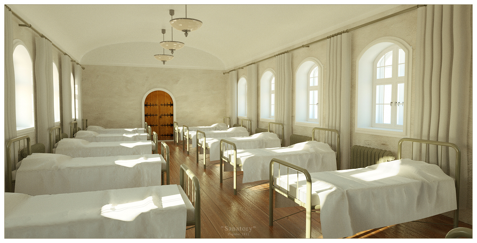If you want to sell this as a sanatorium you should try to add some old looking crates beside or in front of the beds (for personal belongings). Also add some pipes for the radiators.... for the light fixtures try to go with some steel wireframe because in sanatorium nothing is breakable, also add some wire on the windows so no one can escape... :) that should do it.