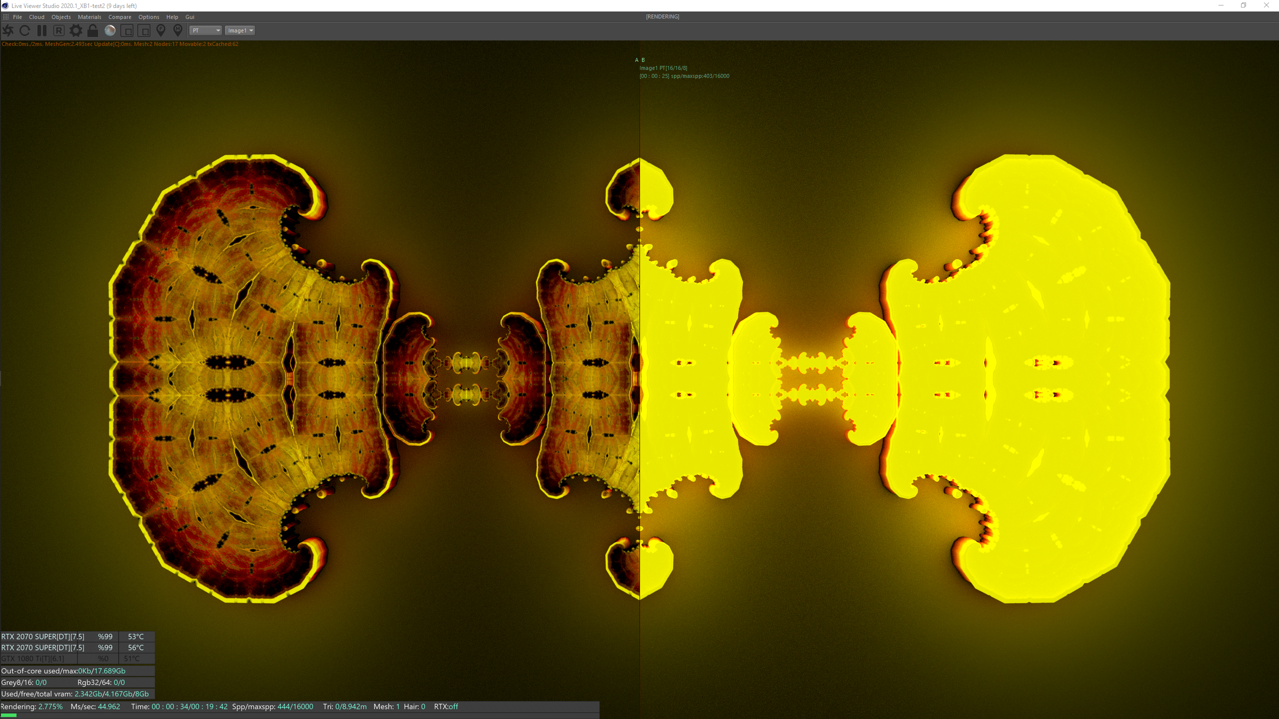 Lastly, below are my results of that 8.9 million tri object, in a render comparison, using the PT kernel with RTX OFF on the left and RTX ON on the right. Maybe a bug or something?