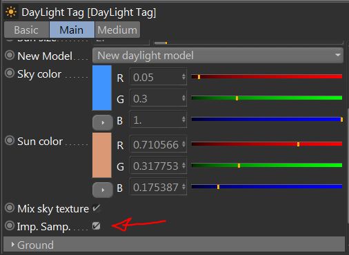 I select the beauty passes ( diffuse direct, indirect, reflexion direct, indirect, transmission, refraction, shadow .. 2/ I select the ambient light direct indirect, sun direct, indirect 3/ I set the render buffer to float(linear) as recommended by andrey lebrov 4/ In the sun settings, I enable the “imp sample”, as recommended in octane's manual, for the shadow ( although i'm not sure how to use the shadow pass ) :