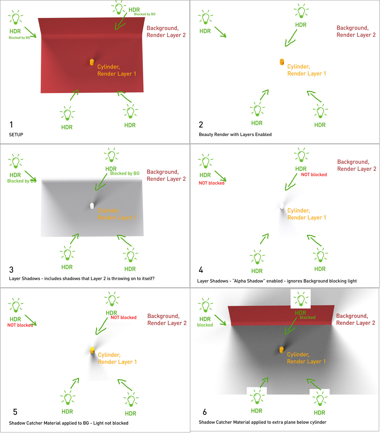 3) Layer Shadows - this seems wrong? I have it set to Layer 1, so I'd expect to see only the shadows that Layer 1 (Cylinder) are throwing on to Layer 2 (Plane), instead I also get the shadows that Layer 2 (Plane) throws on to itself?