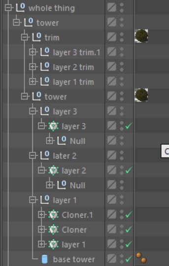 I was shown a method of building structures like castles or whatever using cloners. I can use render instances but that detracts from the look since procedural textures aren't dynamic and repetitions are easily visible. I attached an example of how it's set up. Just a bunch of cloners all grouped in a null so the material applies to everything the same while procedural textures treat it as one massive object.