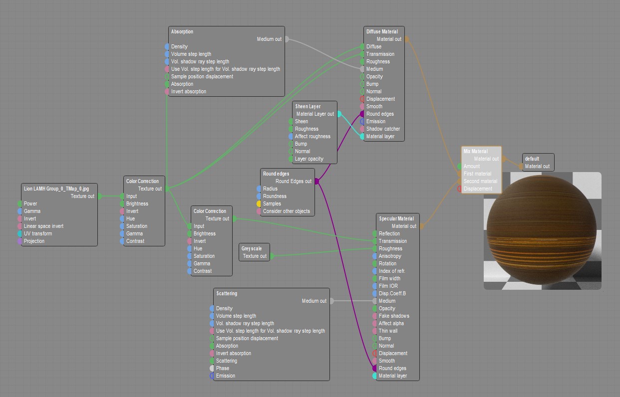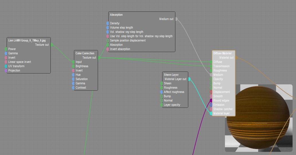 The Diffuse Material node is fairly simple. I used the LAHM hair texture that came with the lion and just adjusted a bit to enhance it to my liking using the color correction node. This Color Correction node you will have to adjust to your liking. I then simply plugged it into the Diffuse pin and Transmission pin of the Diffuse Material. Next I added a Absorption Node and for the Absorption pin I used the same output from the Color Correction node that I used in the Diffuse Pin. I Invert absorption so that the color absorbed is the opposite color of the texture and the final result is the color of the texture. It may be not very apparent with the texture I am using (or with what you might use) but try as an experiment with a solid color like Red and see what invert absorption - ON / OFF does. As the hair stand is very thin, I used a Density pin of .1. You can experiment with different values here. I used small value as i wanted translucency. Finally I added the sheen. This again you can adjust to your taste. For me I kept the Roughness pin to .3 and Sheen pin to RGB 72 72 72.