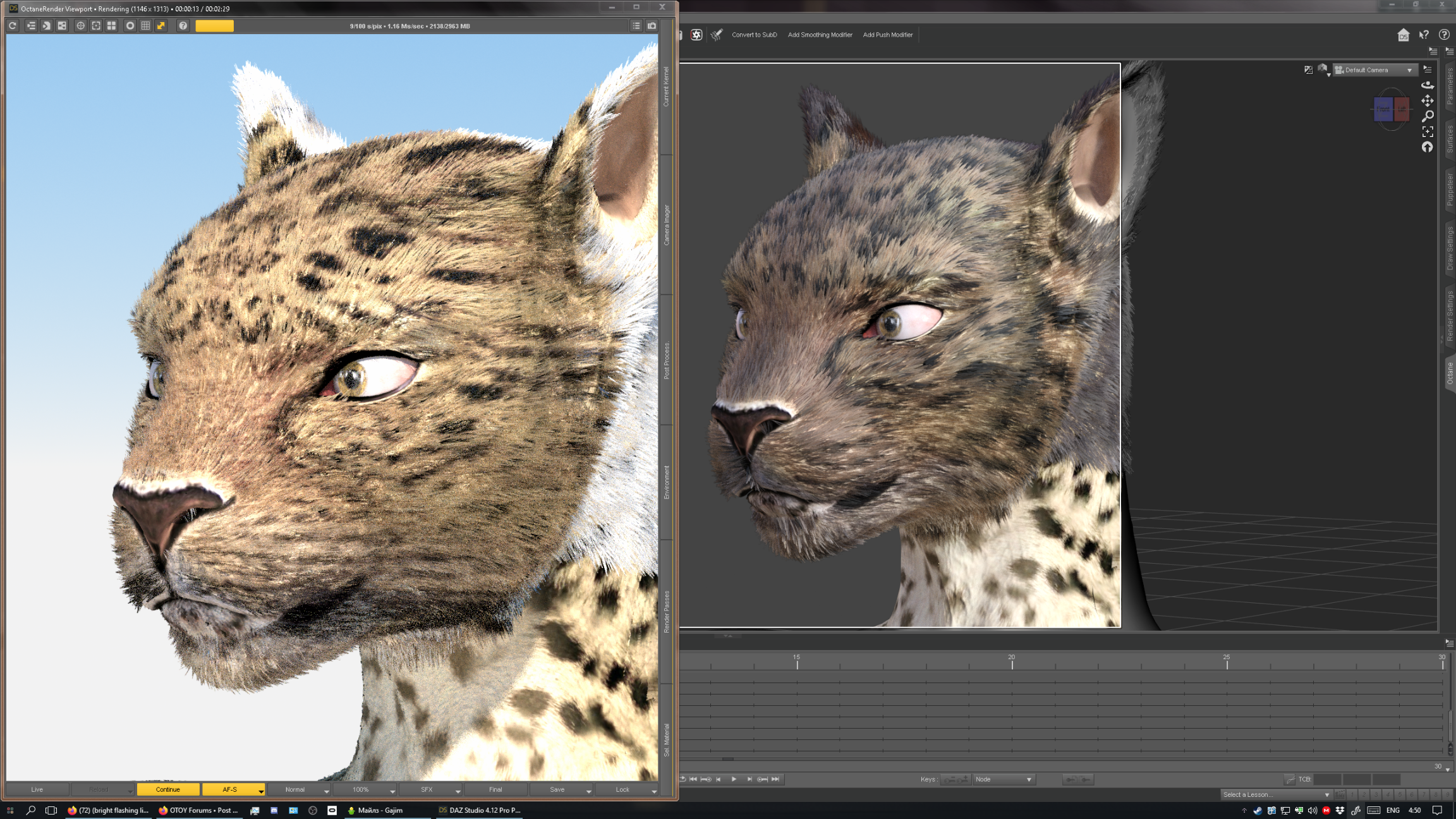 Though I had tweaked everything from the skin to the whiskers to the eyes to the claws to the fur, in this post I am only talking about the fur. The Lion is the Feliidae By AM - Lion LAHM version (Lion - LAMH - Color Scheme 1) available at the Daz3D store. I never render in IRAY so I will not be providing any comparision with IRAY. I do believe the IRAY material is better because you can color the hair root and tip diffrently which obviously we can't do in the Daz Octane plugin. So the aim here was is to see how to make the fur look good in Octane. Also when I convert the hair to Fiber Hair using the LAHM plugin I increased the hair count by a lot. E.g. for the boby hair group, I added a million extra hair strands. I did so so that the fur looked more dense. Do note it increases the memory requirements. So if your GPU cannot handle the increase in hair strand count, don't do it.