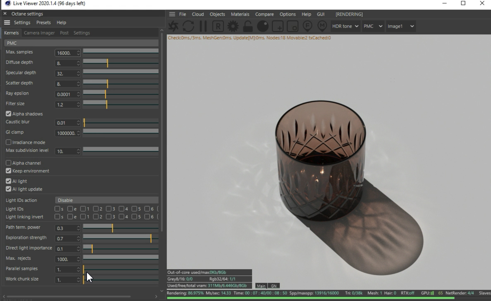Interesting, I'll give it a try. FYI - The Octane manual for Houdini and the YouTube tutorial videos that Otoy has published only mention that raising Parallel Samples can help render speed. There is no connection made to caustic rendering (even in the video about the PMC kernel and caustics). It might help others to have that info published.bepeg4d wrote:Hi