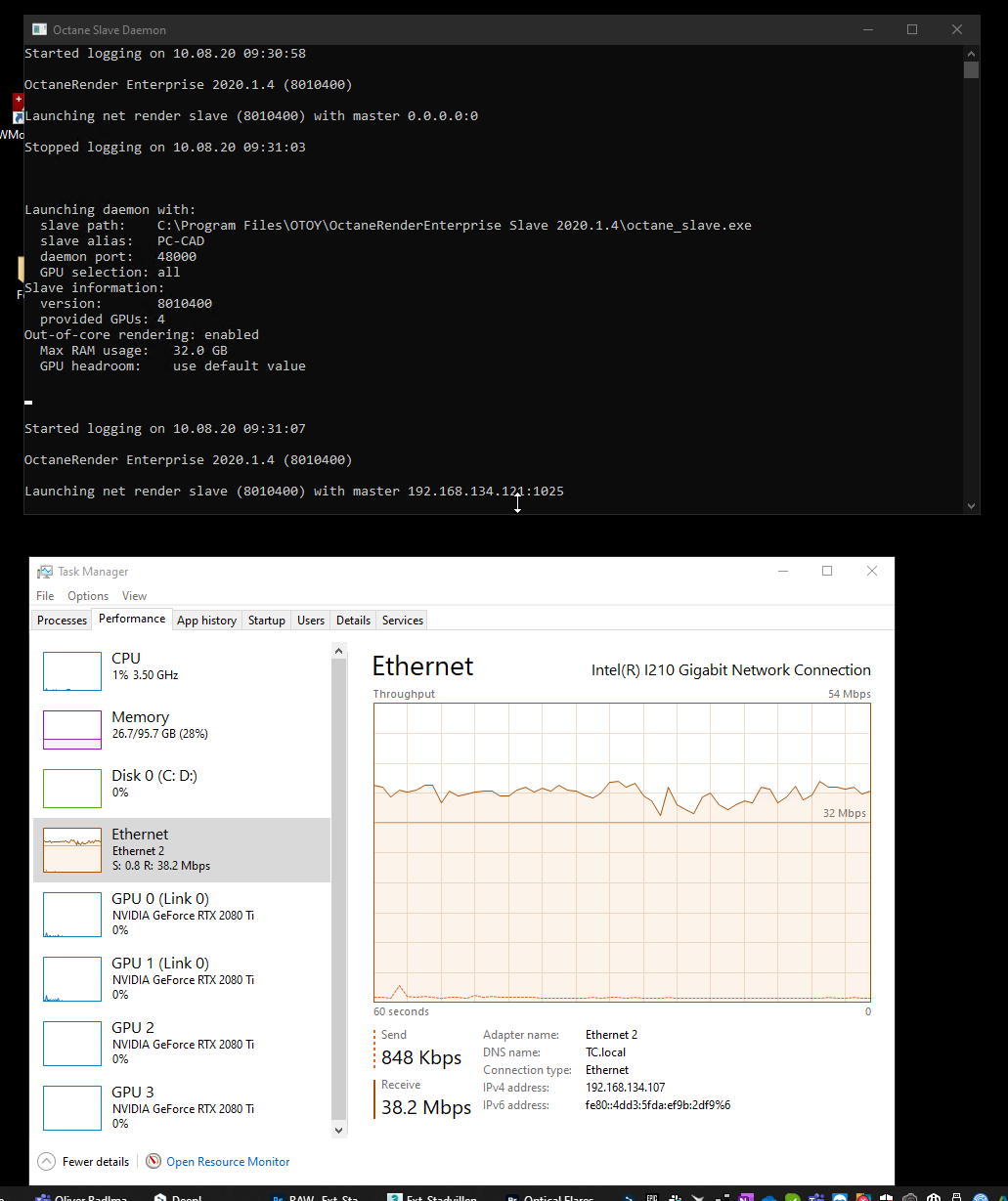Our master and slaves are connected to the switch. The router is also connected to the switch supplying all PCs with the internet. Now slaves start rendering almost immediately.