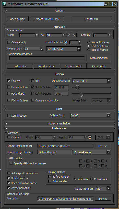 And when you click "Render still", files "Renders/OctaneRender.obj", "Renders/OctaneRender.mtl" and "Renders/OctaneRener.ocs" will be created and render will begin (almost the same in animation render but I'll describe it separately due to new "batch alhorythm"). You can change the default render-project name if you want to, e. g. if you change it to "SomeProject" - the files "Renders/SomeProject.obj", "Renders/SomeProject.mtl" and "Renders/SomeProject.ocs" will be created in the Max project folder. And this new given name will be saved between plugin window openings.