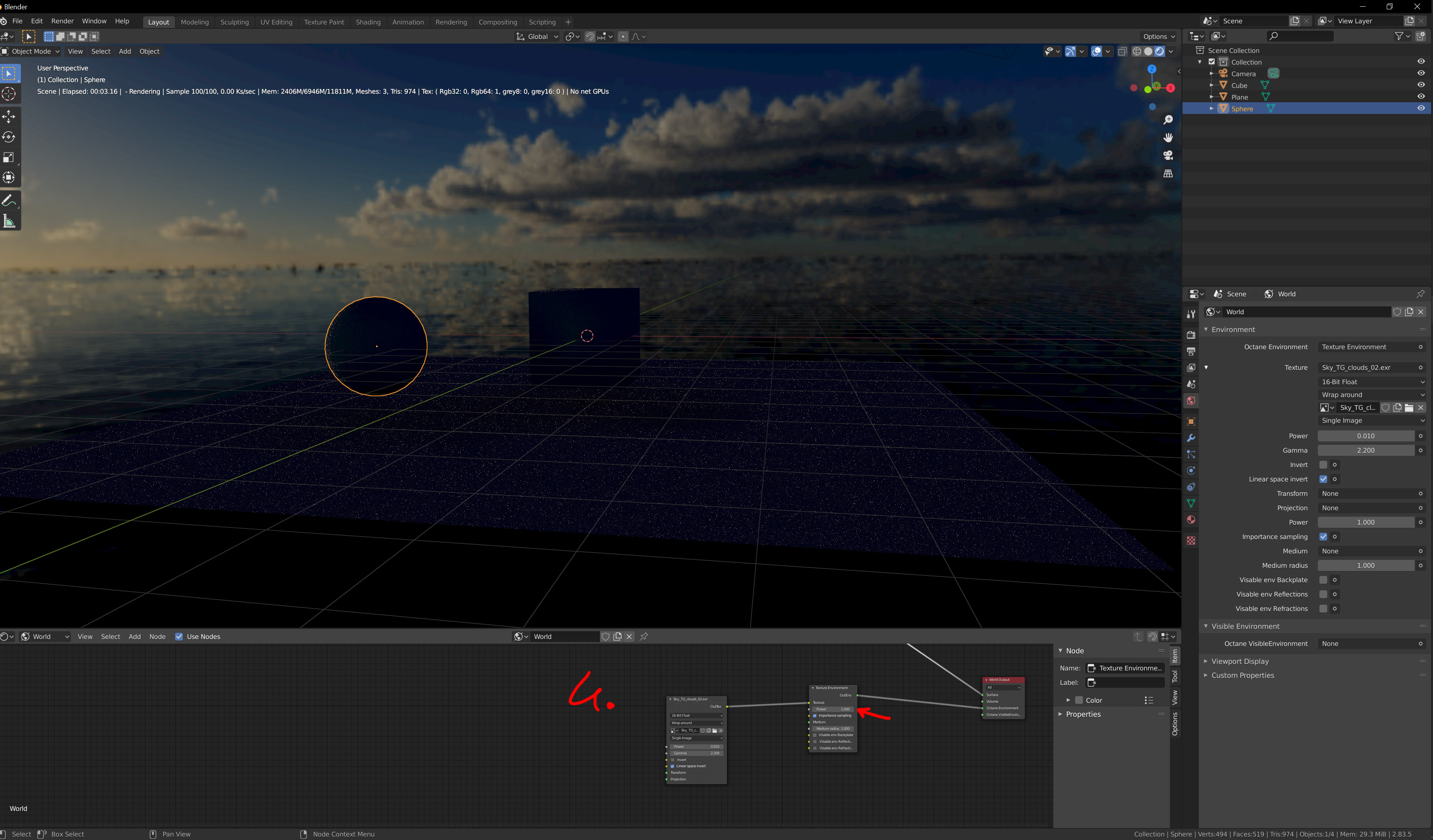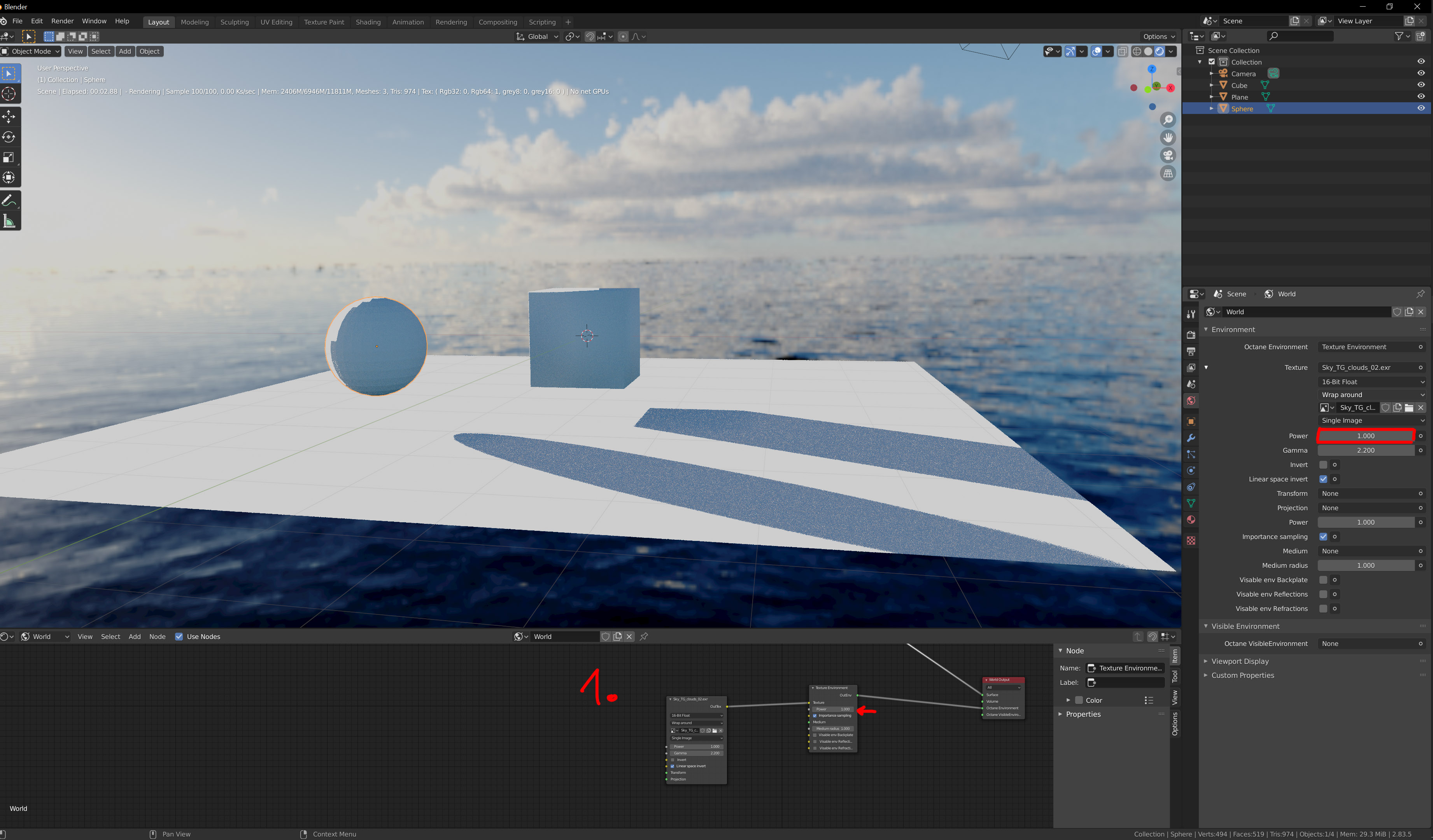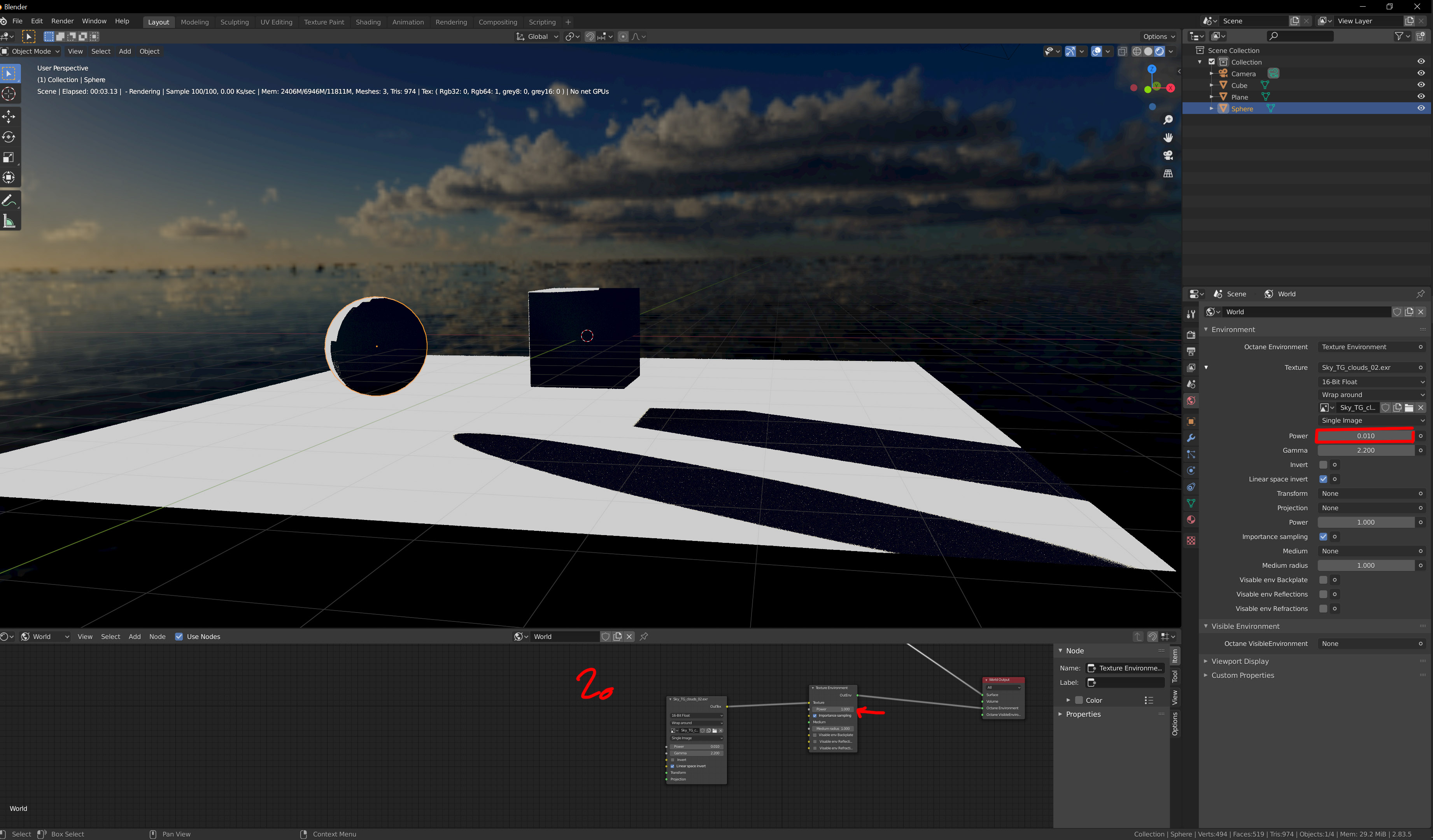 5. i reset the first value i´ve changed back to 1, and just try the same trick: setting the power of texure env node to 0 and then 1, and the result looks as if there is no direct light at all, only ambient.