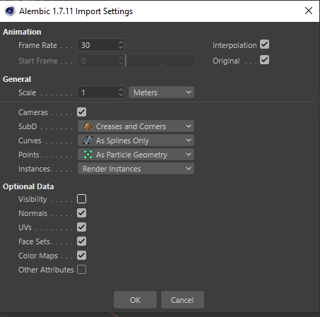 Than i open Cinema4D and import single Alembic file with this parameters.