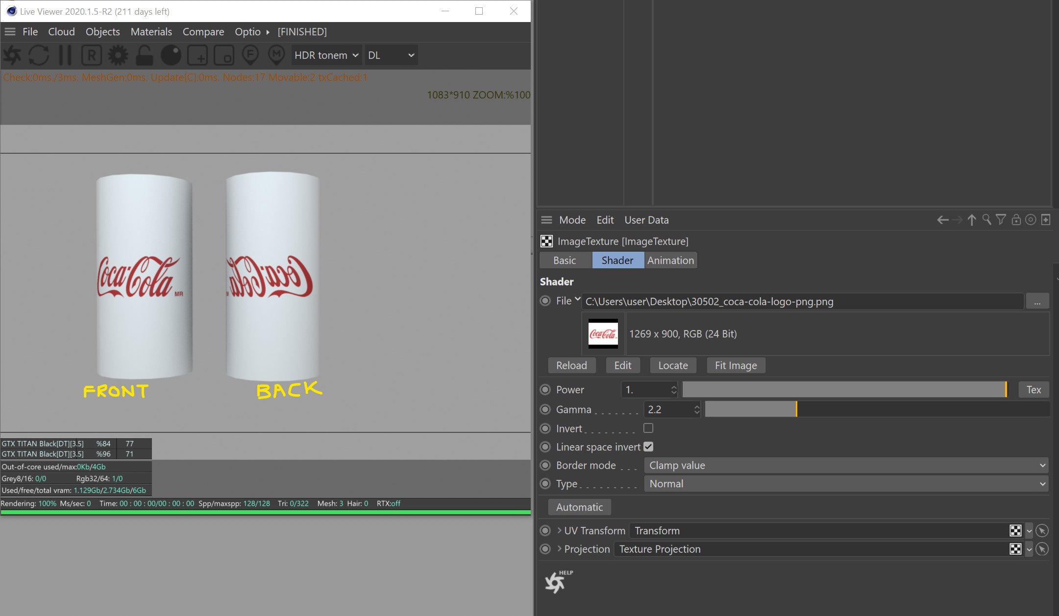 * note: With native C4D texture tags, the Flat projection can be split between two materials by rotating the Flat plane's coordinates by 180 degrees.