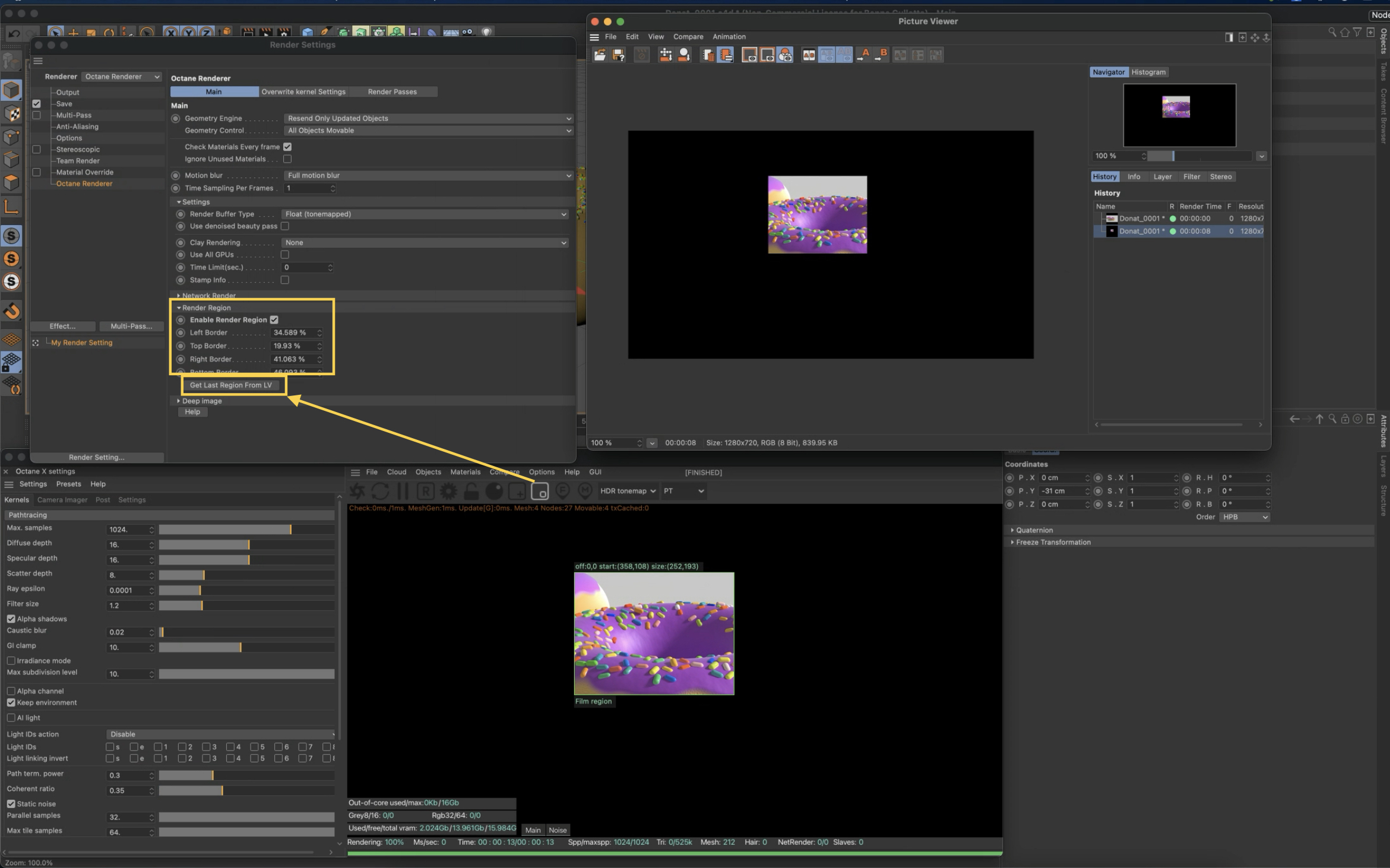go to render settings/octanerender/main tab/render region, and click on the “get last region from lv” button: