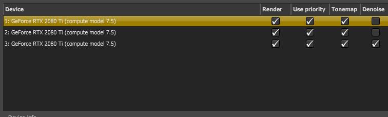 1. Disabling Denoiser on certain cards. My 1200W PSU was not sufficient enough to have AI Denoiser enabled on 3x RTX 2080 Ti. Having this config would cause my computer to blue screen and shut down, specially when I would render to Picture Viewer/use Render Queue. The solution was to check Octane settings and disable AI Denoiser on 2/3 RTX 2080 Ti cards before I would send to render. On a machine with 1200W PSU and a 1080 Ti and 2080 Ti, BSOD was never an issue.