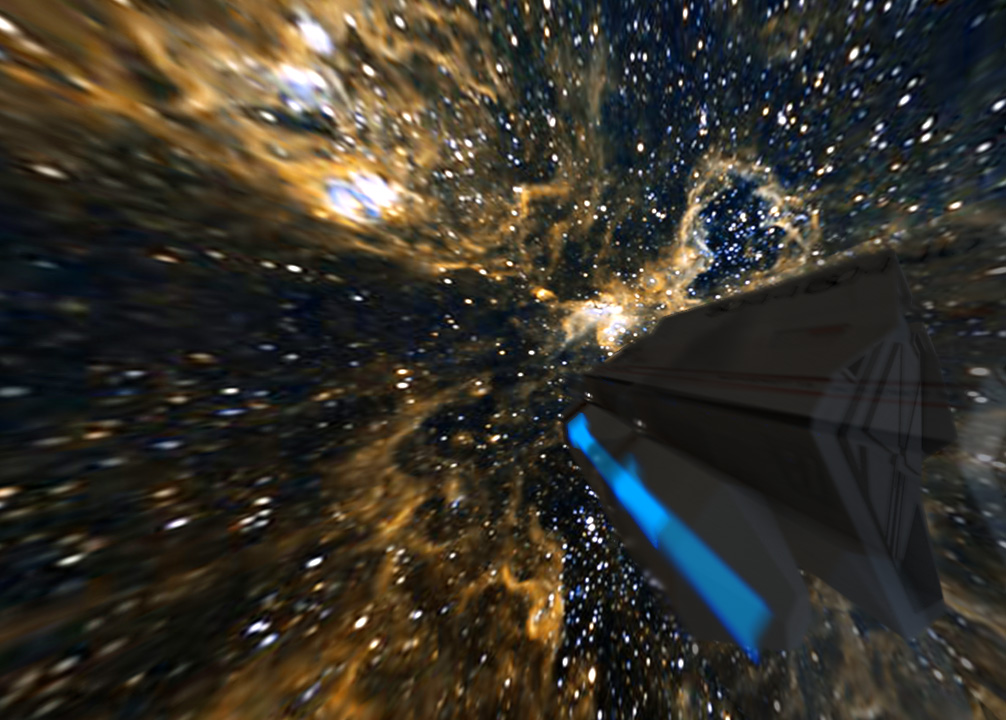 The Star field map and the Shuttle craft were heavily distorted in Octane using a camera setting of about 170deg to get that warp effect on the ship and the star field.