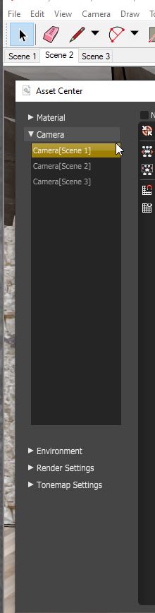 - Each view has its own camera instance. All camera instances are listed in the Asset Center.