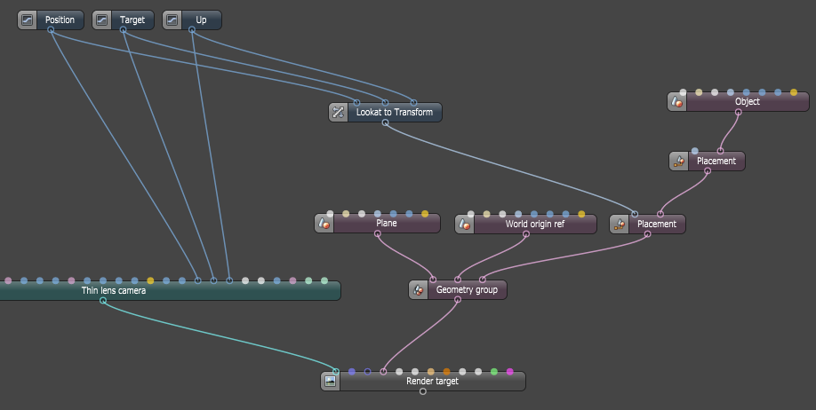 - Expand the Position, Target and Up-vector nodes from the camera, and plug them into the Lookat to Transform node.