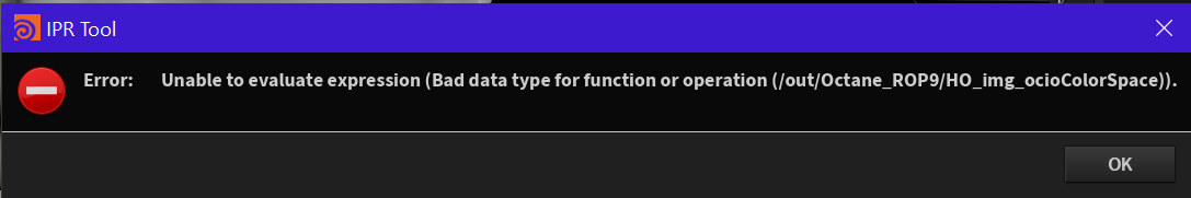 When I keep using ACEScg as color space, 1: it looks dark in IPR (like ipr doesn't support aces suddenly). 2: I have an error of the ROP: unable to evaluate expression ... ROP/HO_img_ocioColorSpace.