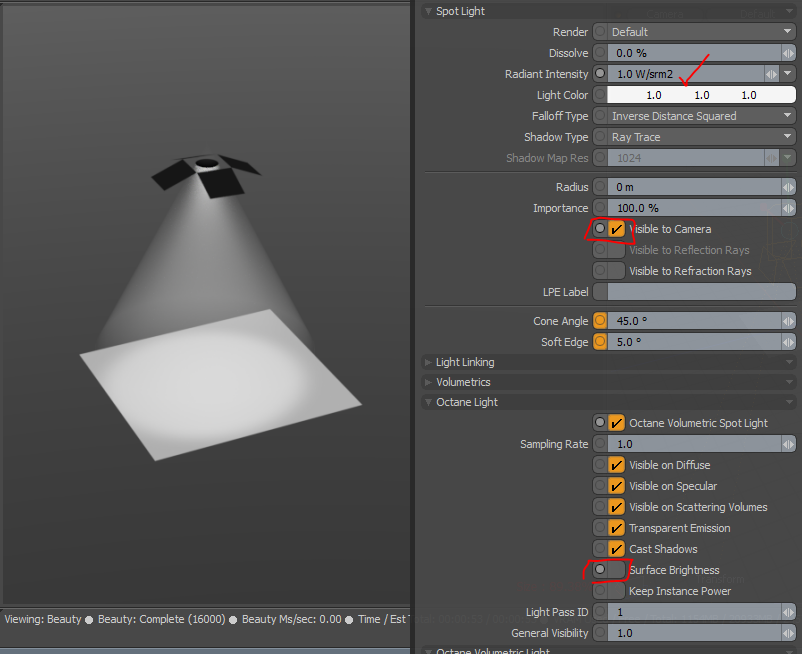 The second quirk is we have octane's "surface brightness" enabled by default, which doesnt work well for spotlights. You need to use high radiant intensity values like 1000.