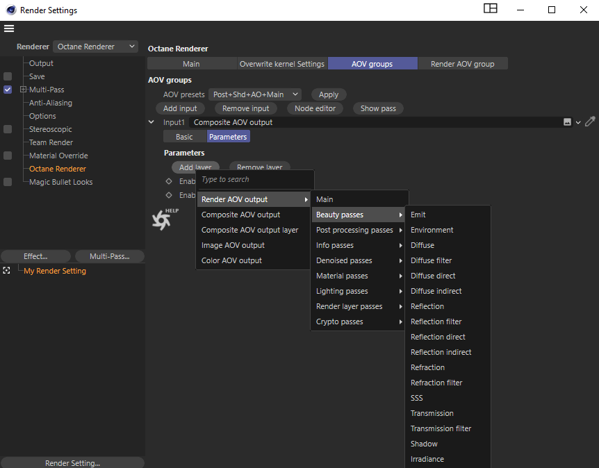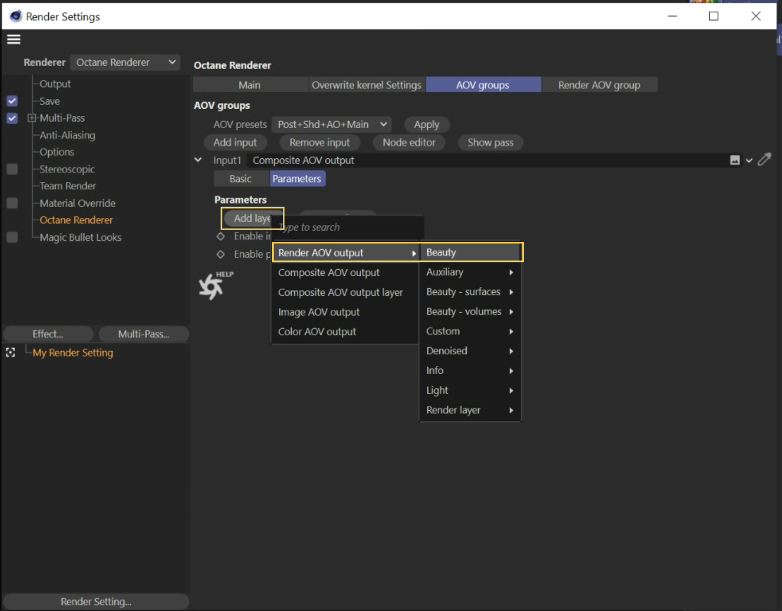 3. Go to Render Settings/OctaneRender/AOV Groups, and press Add input button: