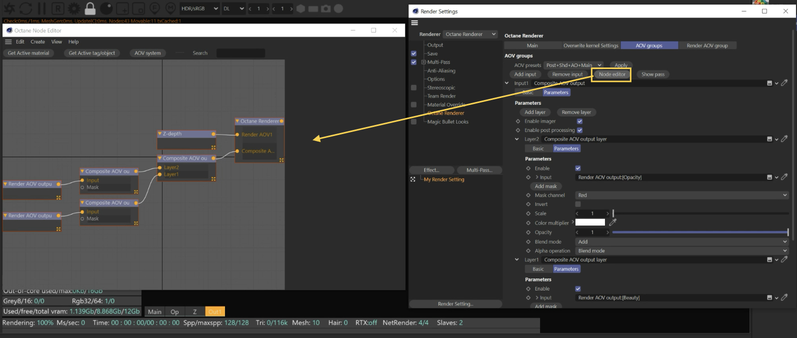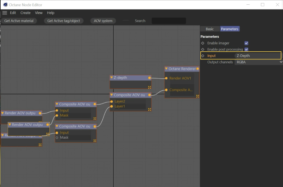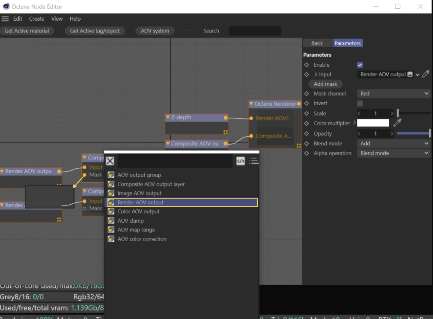 7. In the Node Editor, extract the Mask pin from the Opacity layer, and choose Render AOV output: