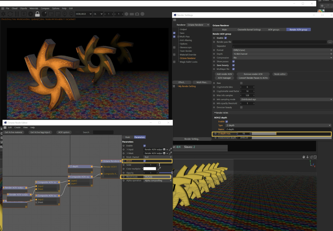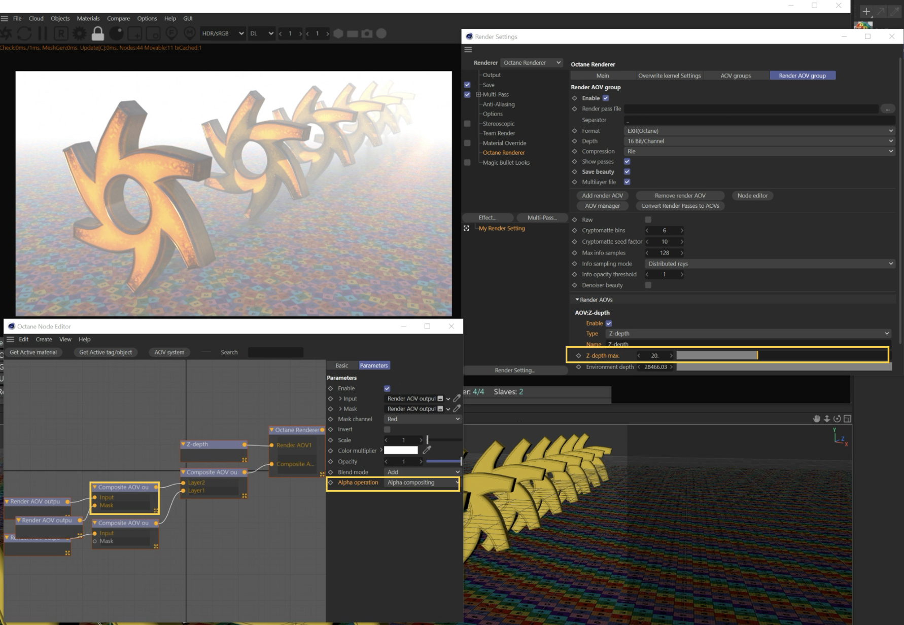 9. Finally select the Composite AOV node, and change the Alpha operation to Alpha compositing, you can continue to fine toon the Z-depth Max value, checking the result in Live View: