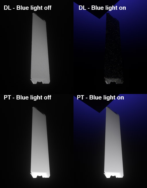 When using Direct lighting, adding a soft, low power light to the background of my scene completely obliterates all the foreground lighting. When using Pathtracing, this does not happen.