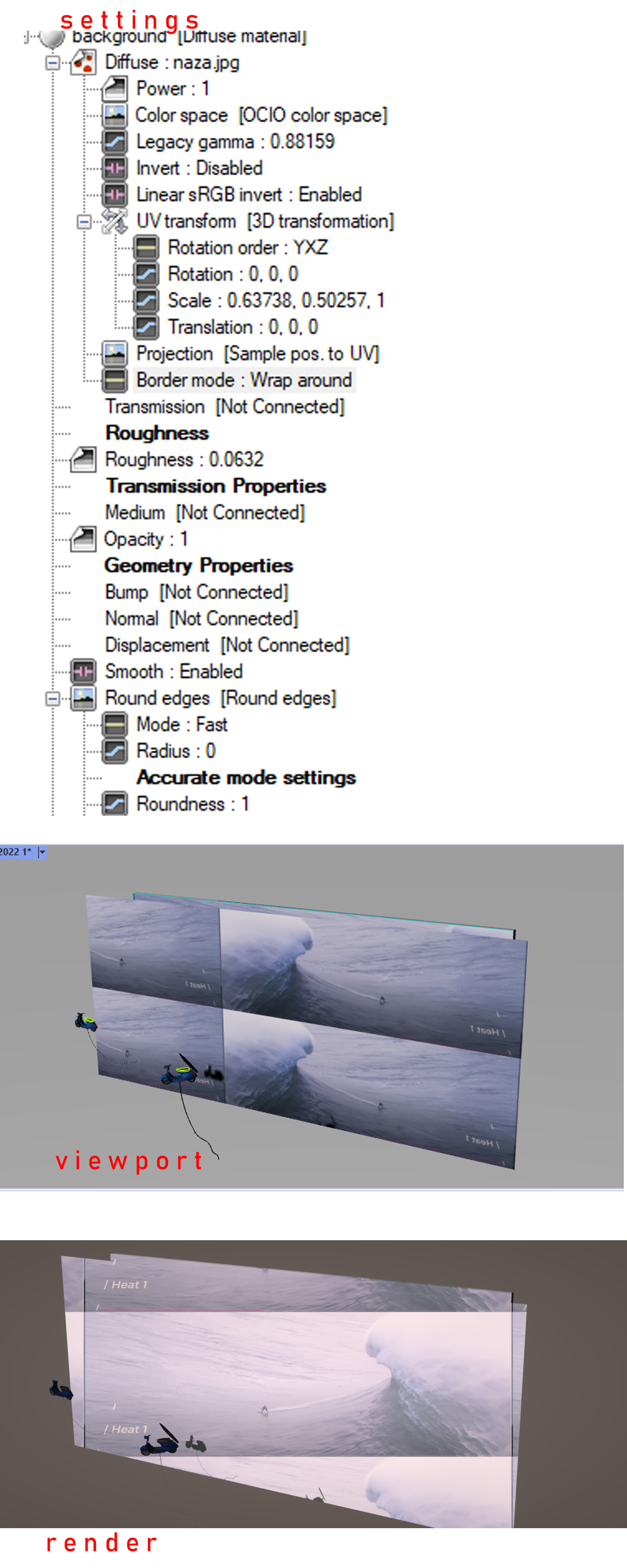 Here im trying to put an image on a box in the background but the image rendered in the view port is different to the actual rendering.