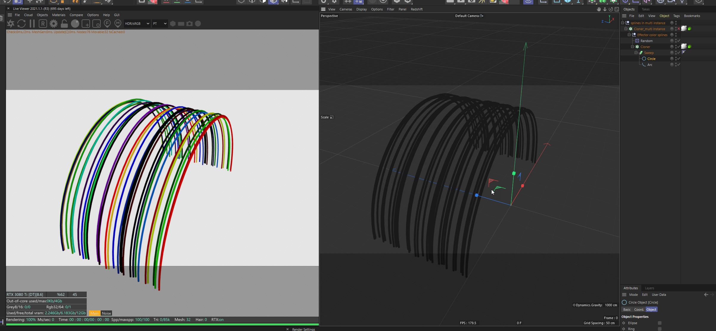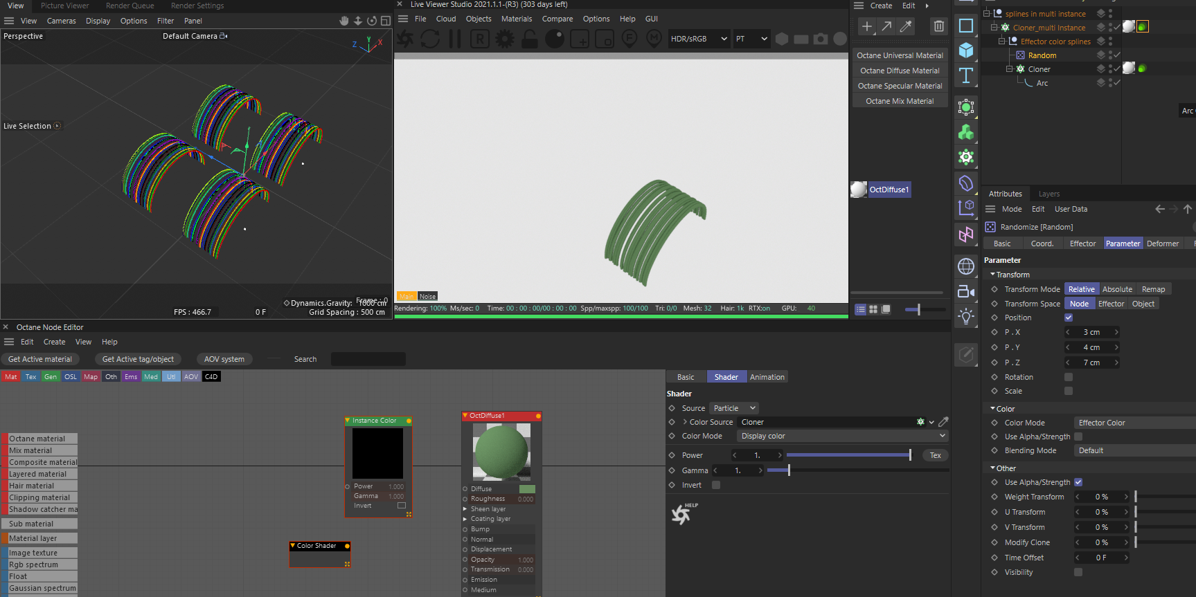 1 - When I clone spline object and drive the random color with a random effector, the random effector seems to be working in the c4d viewport, but it doesn't in the octane IPR.