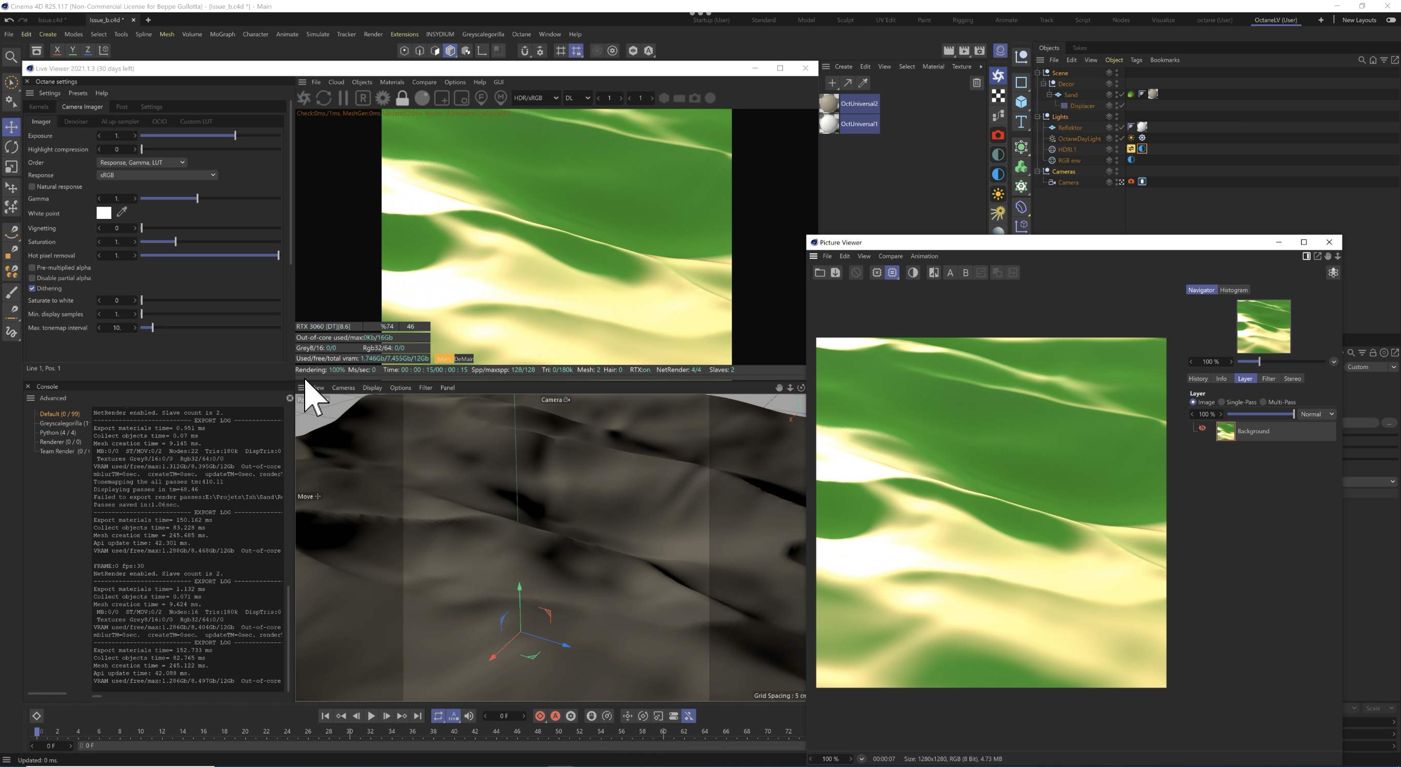 the issue seems related to GSG HDR Link Plus node, if I copy paste everything from your scene into a new scene, the Texture node is missing: And the result is greenish in both Live View and Picture Viewer: If I reassign the correct HDR texture you have shared, Live View and Picture Viewer give the same result: ciao,