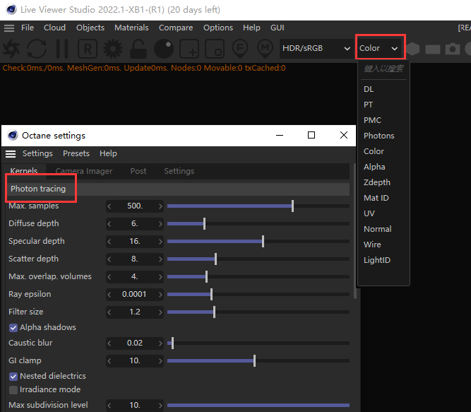 1.When the rendering kernel is set to ‘Photon tracing’, the preview window displays the ‘Color’