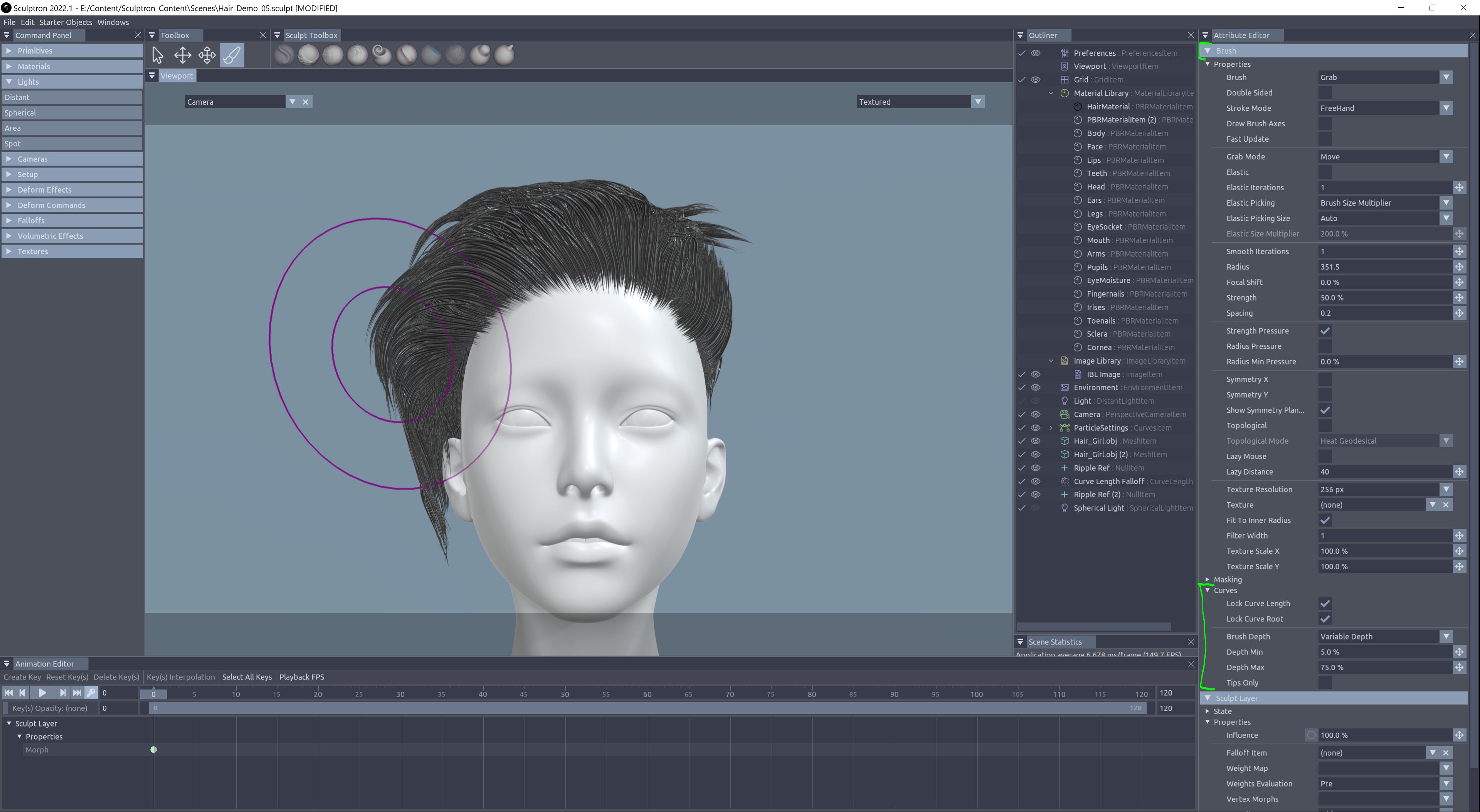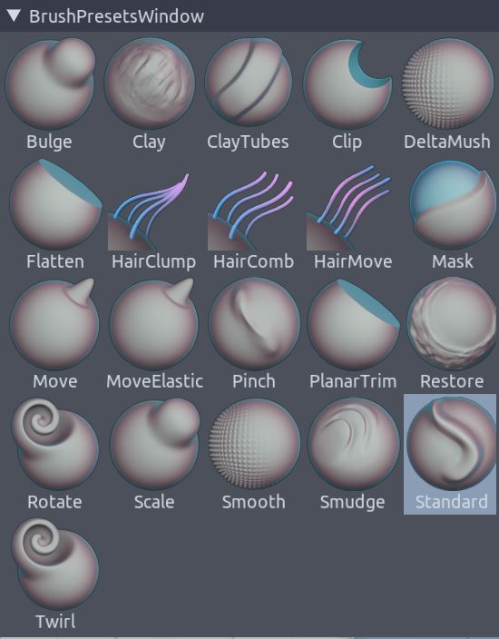 We've created 3 specific brushes dedicated to hair sculpting (other brushes can somehow work when that makes sense for curves, feel free to test those as well): HairClump, HairComb, HairMove.