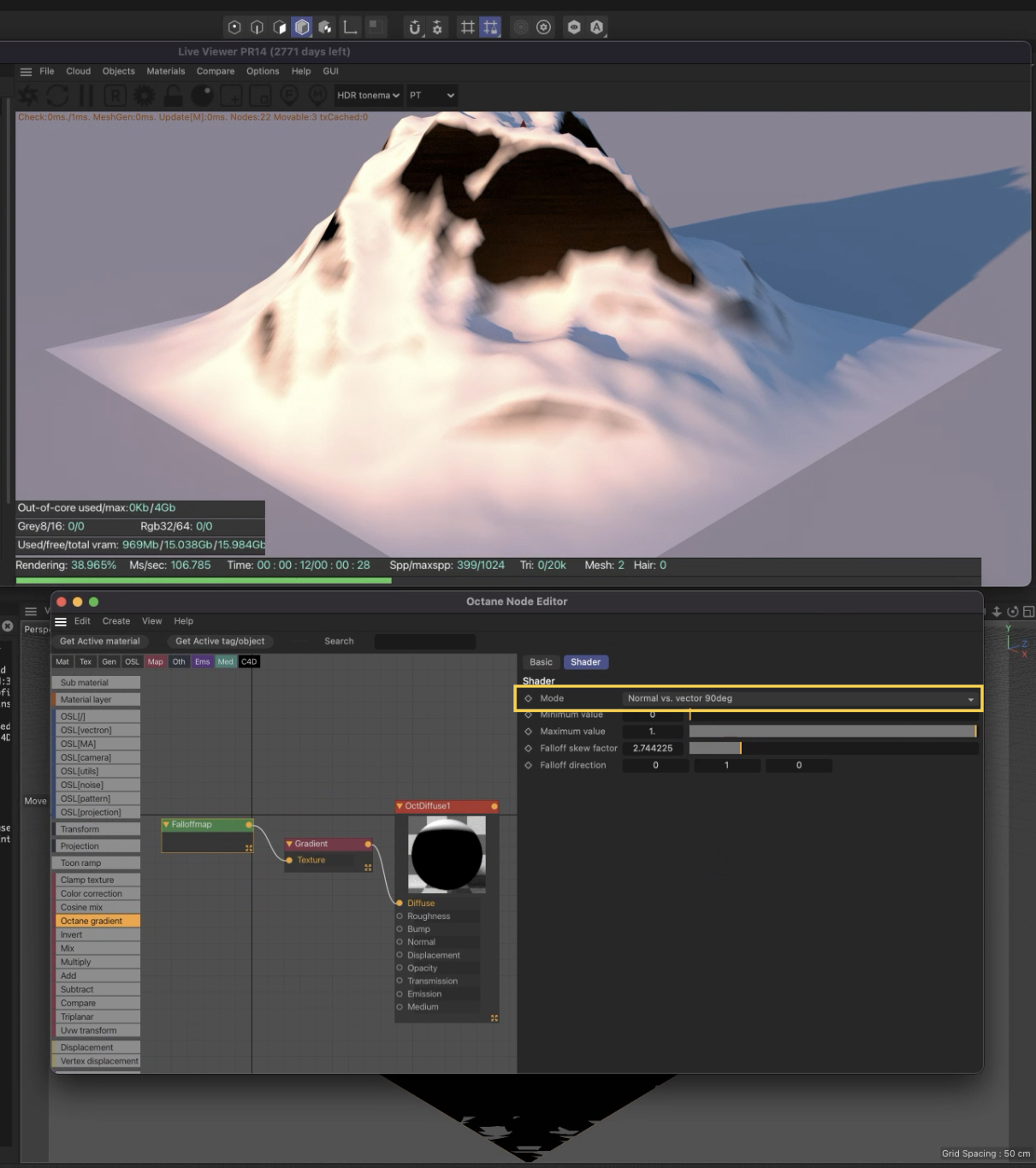 Anyway, you can obtain the same effect by using an Octane Falloff node in Normal vs vector 90deg mode: And use an Octane Gradient to define the blurriness you want: ciao,