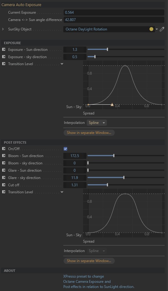 Added actual exposure information, camera to sun angle difference ( which help to set proper exposures for 0 and 180 degrees ) and input to choose Sky object.