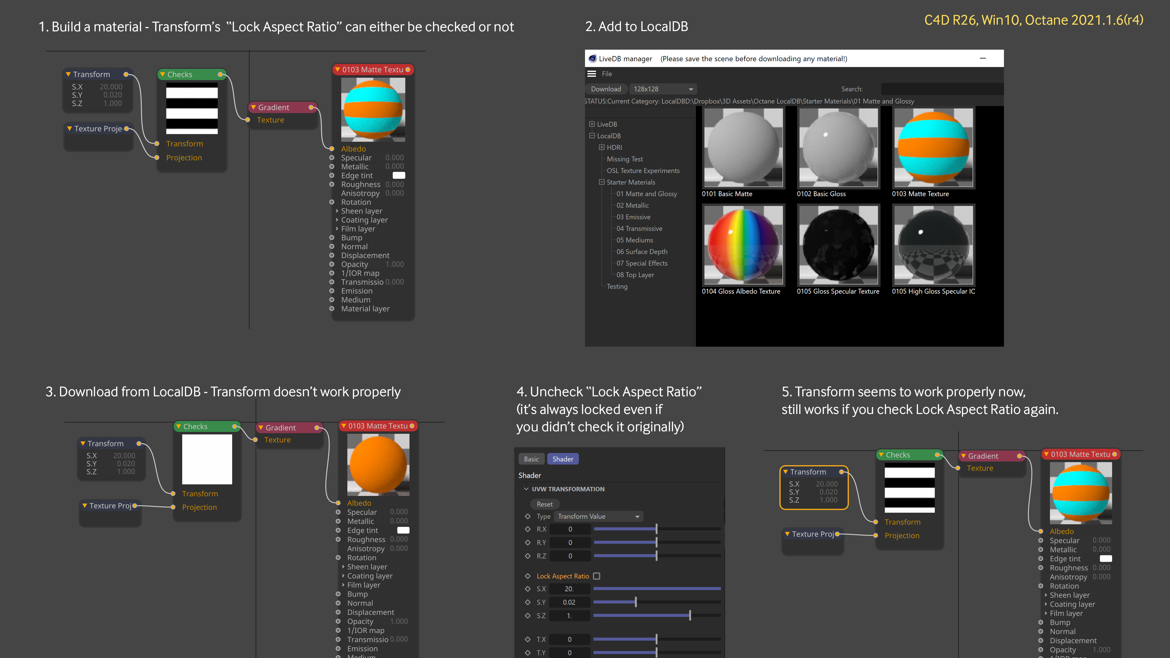 If there's a Transform Node in the network with custom values, it stops working when the material is downloaded from the LocalDB.