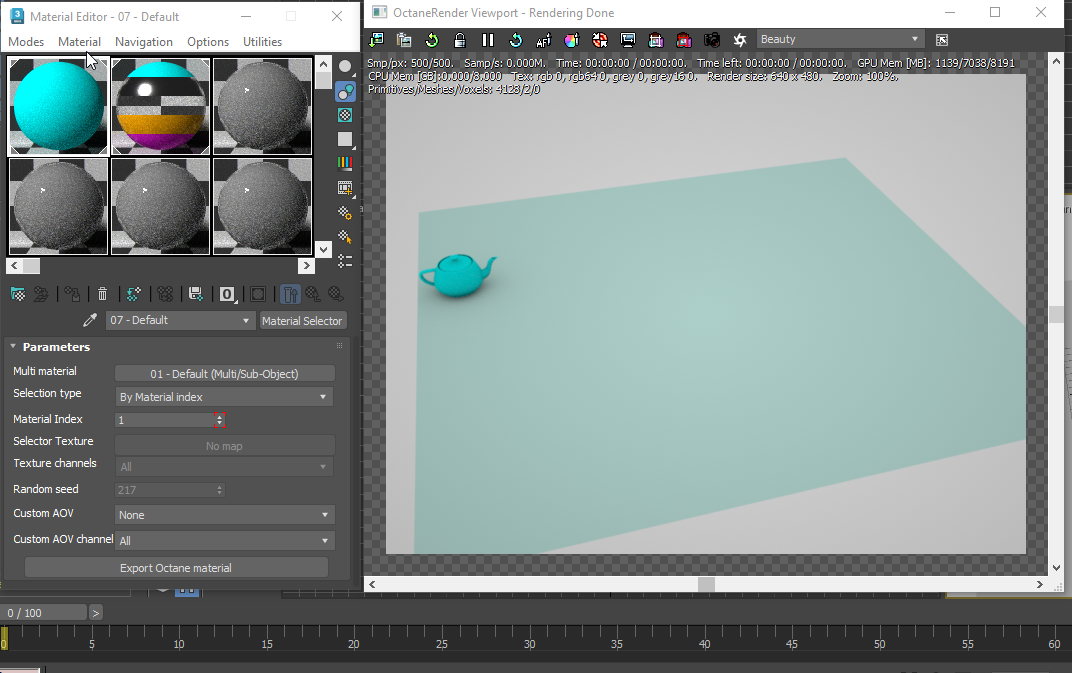 Another sample to illustrate the use of the Material Selector as an Octane interface to the 3dsmax Multi material.