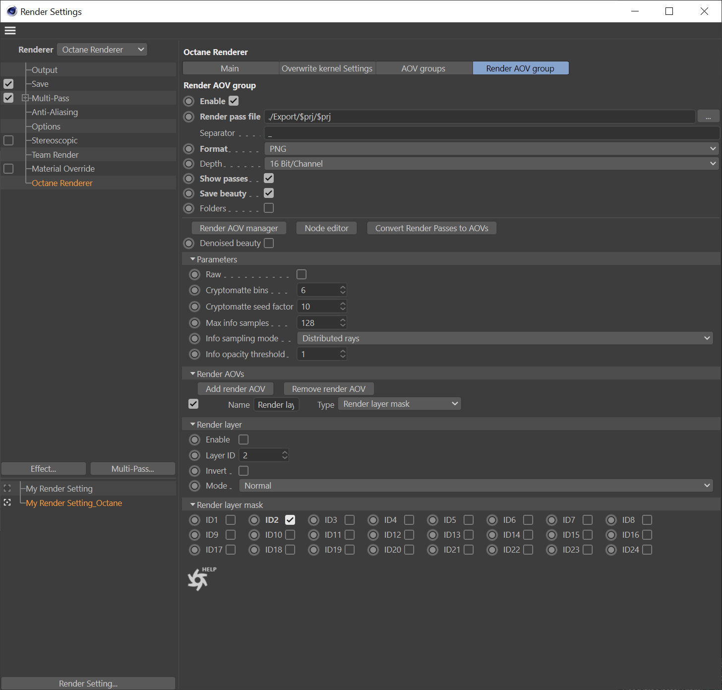 Please can someone help me how to render with octane, when I need for example Render layer ID and just beauty image? Should I use the standart method option in C4D or just Octane AOV passes?