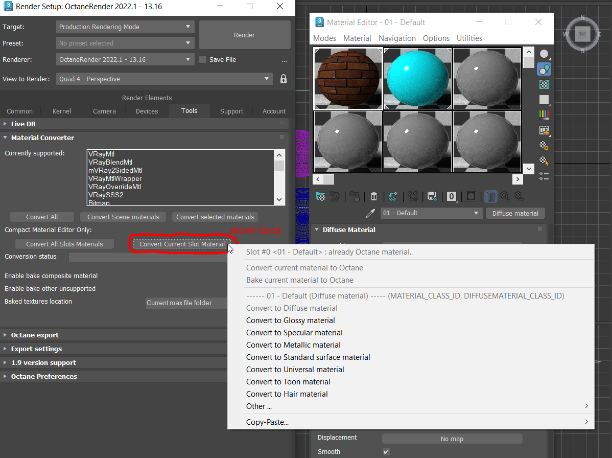 -For Octane materials, in the Context menu of the 'Convert...' button (Right click, instead of Left click)