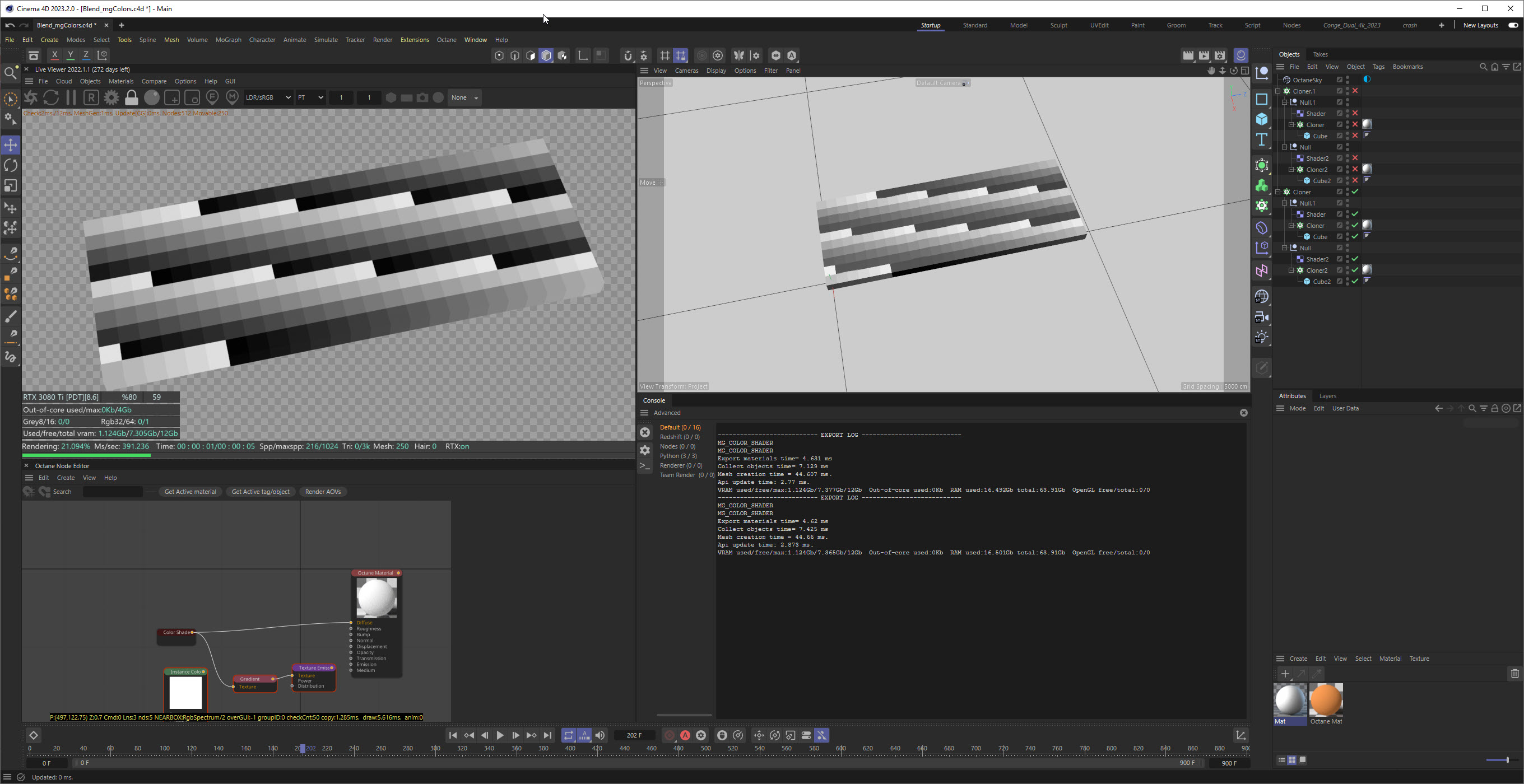 When I use a blend cloner that clones cloners with their own shaders, when I use an octane material to color the child objects using a gradient to map them, it hangs or crashes Cinema 4D spectacularly. It is impossible to generate a log because Cinema 4D either quits too fast or just hangs forever.