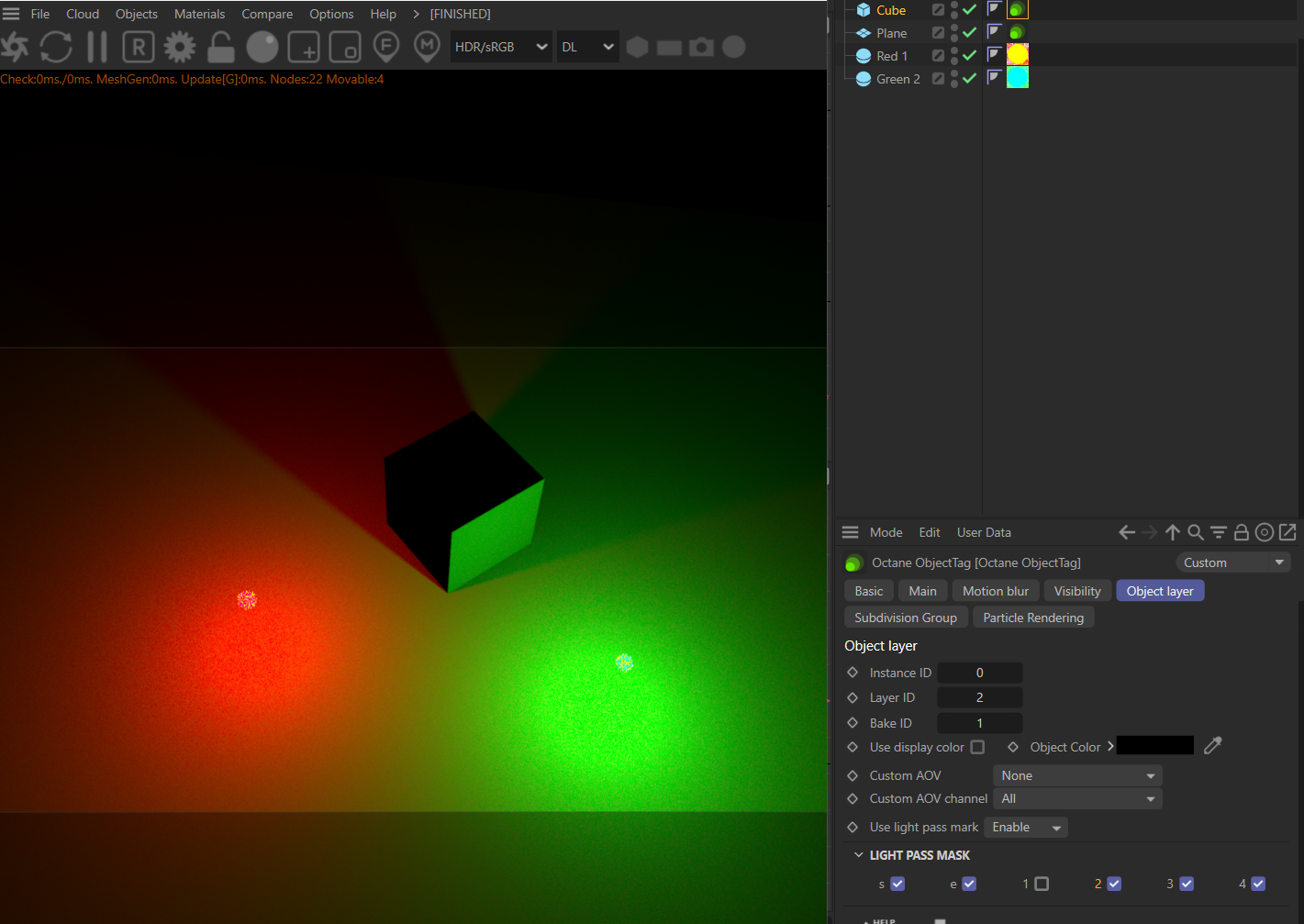 In this example, the cube has light pass 1, the red light, turned off, but light pass 2, the green light, turned on.