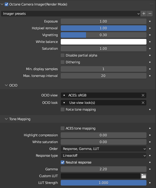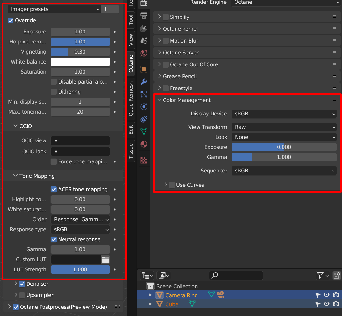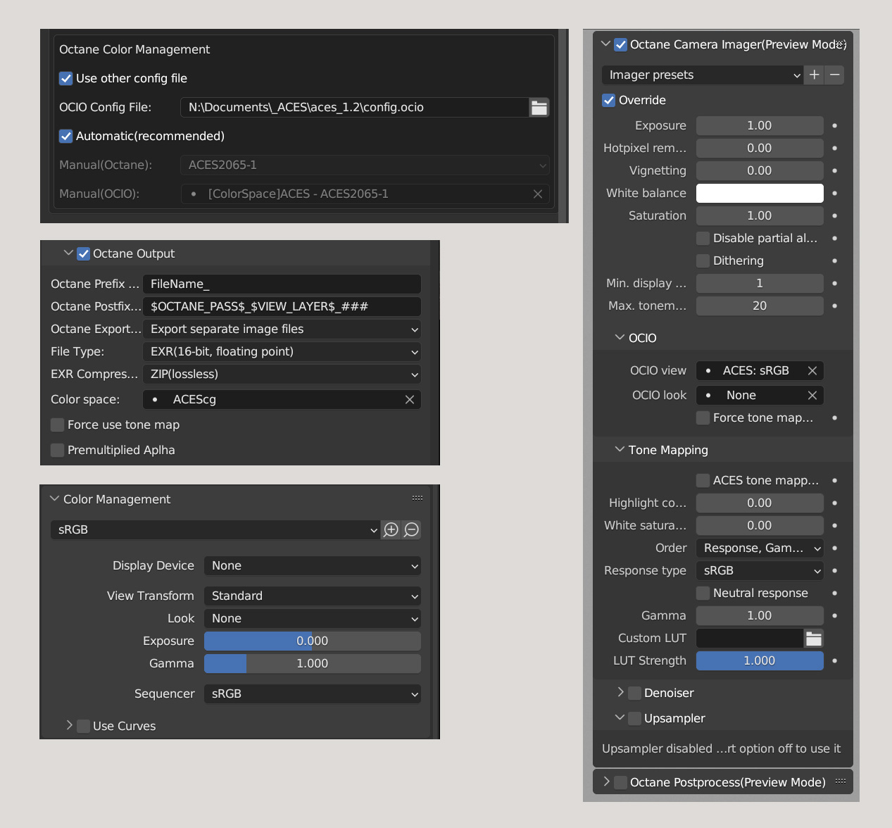 Thanks a lot for the links. Changing the settings in Color Management to "sRGB" and "Raw" looks the same as the settings that I used before. But if that's the proper way to interpret those settings, I might as well use those. I've tried AgX before with the Cycles implementation. There were some issues with color shifting, but I might give it a try again with Octane. For now I'll stick to ACES. Just to keep things simple while I try Octane a bit more.