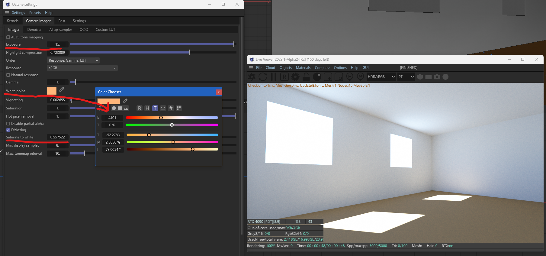Also change camera white point to 4500 kelvin, use "saturate to white". Use Octane Portal material for windows.
