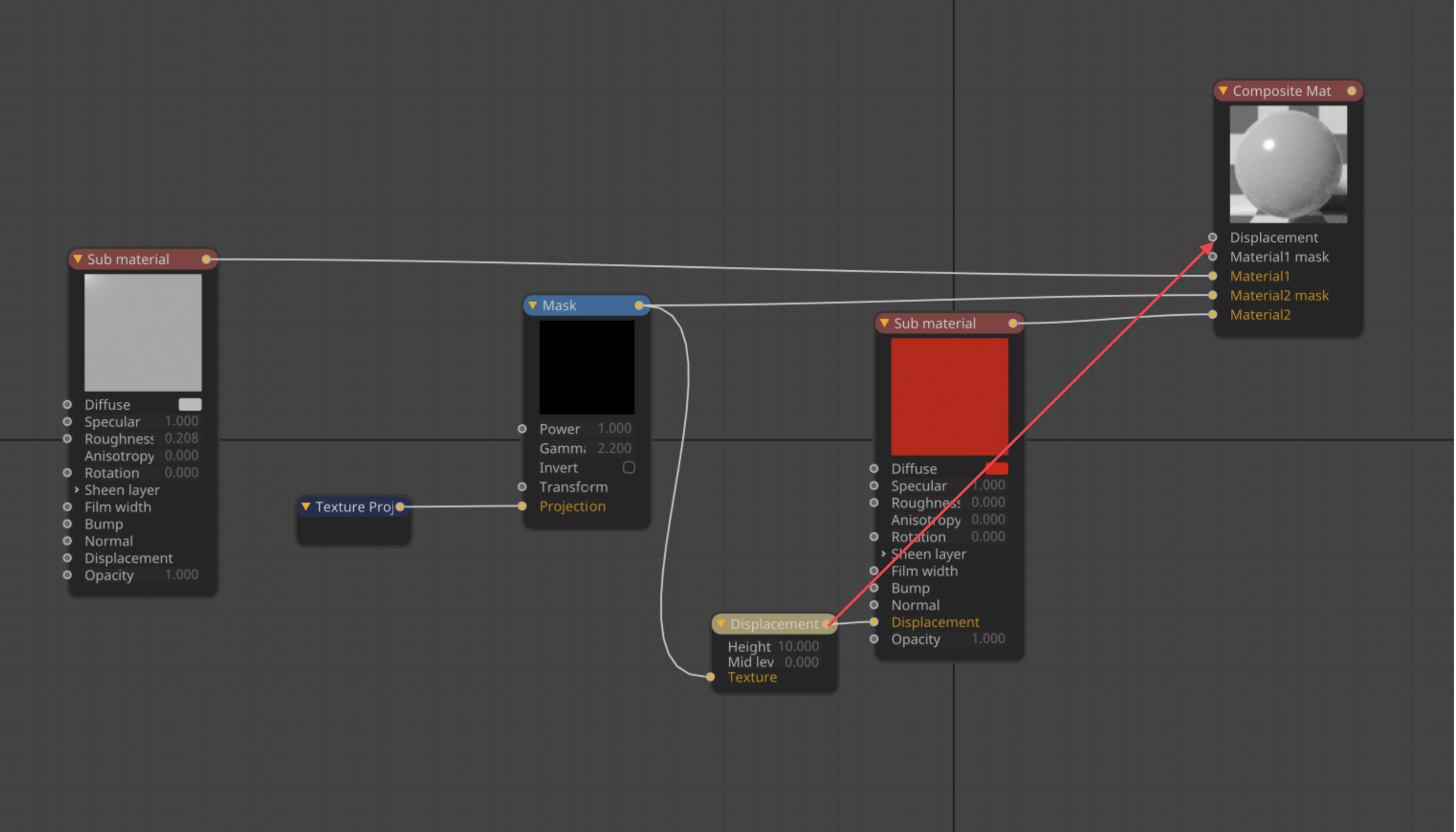 you need to connect the Displacement node to the Displacement pin of the Composite Material, not to the SubMaterial pin: ciao,