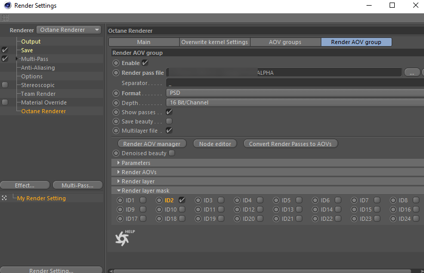Hi, my workflow is usually C4D > Photoshop, and I use the render layer mask feature to produce an alpha layer that I can use in Photoshop. For some reason after I updated Octane the layer mask output I get from C4D is empty, without an alpha channel. I will add a Octane tag to an object, set the layer ID, and then in the Octane render settings I would click on that same layer #.