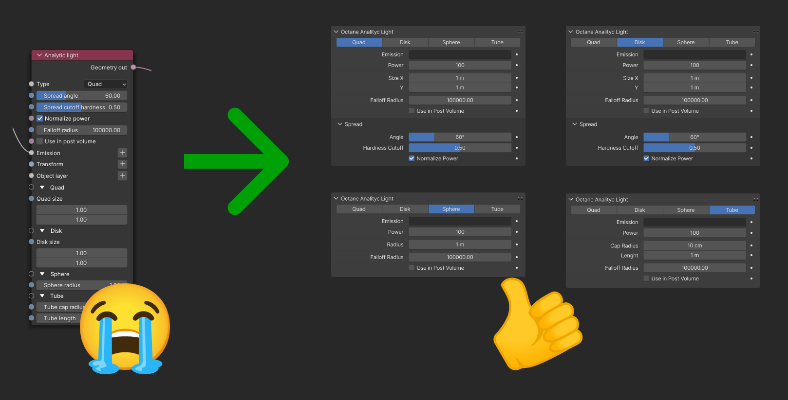 Unfortunately, you're making it further even more confusing with one more node type for lights. Lights are already pretty weird in Octane how they work. In my mind analytic lights should've made it easier to light with more common approach to lights. But how you're adding them in Blender, so far, makes them even worse to me: