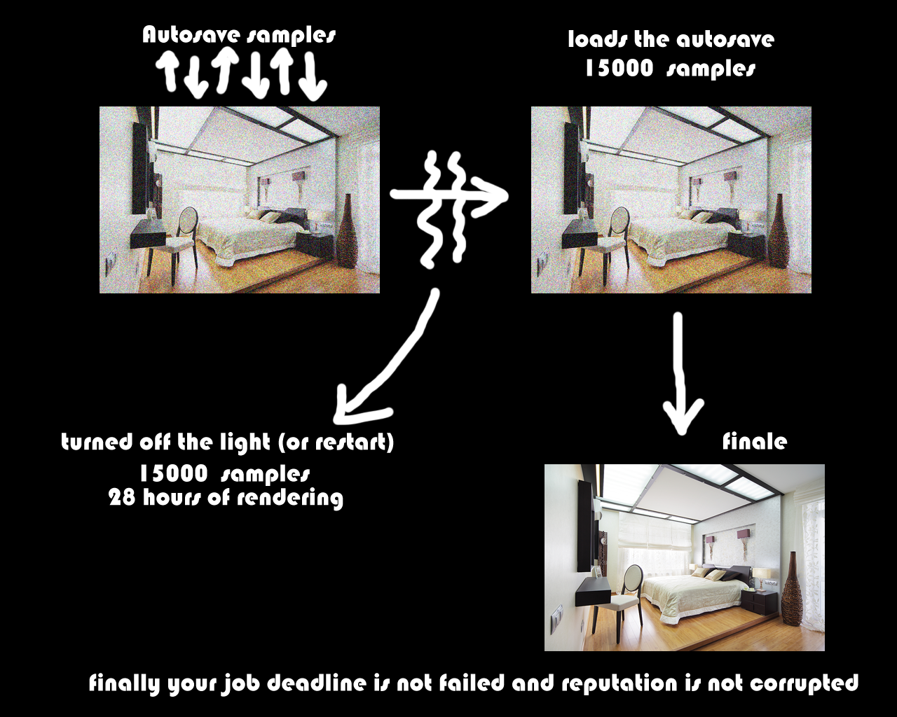 it would be great if you realized render autosave and quicksave in future versions. For example: you render your image for a long time and suddenly light is off. you restart octane ane continue you render.