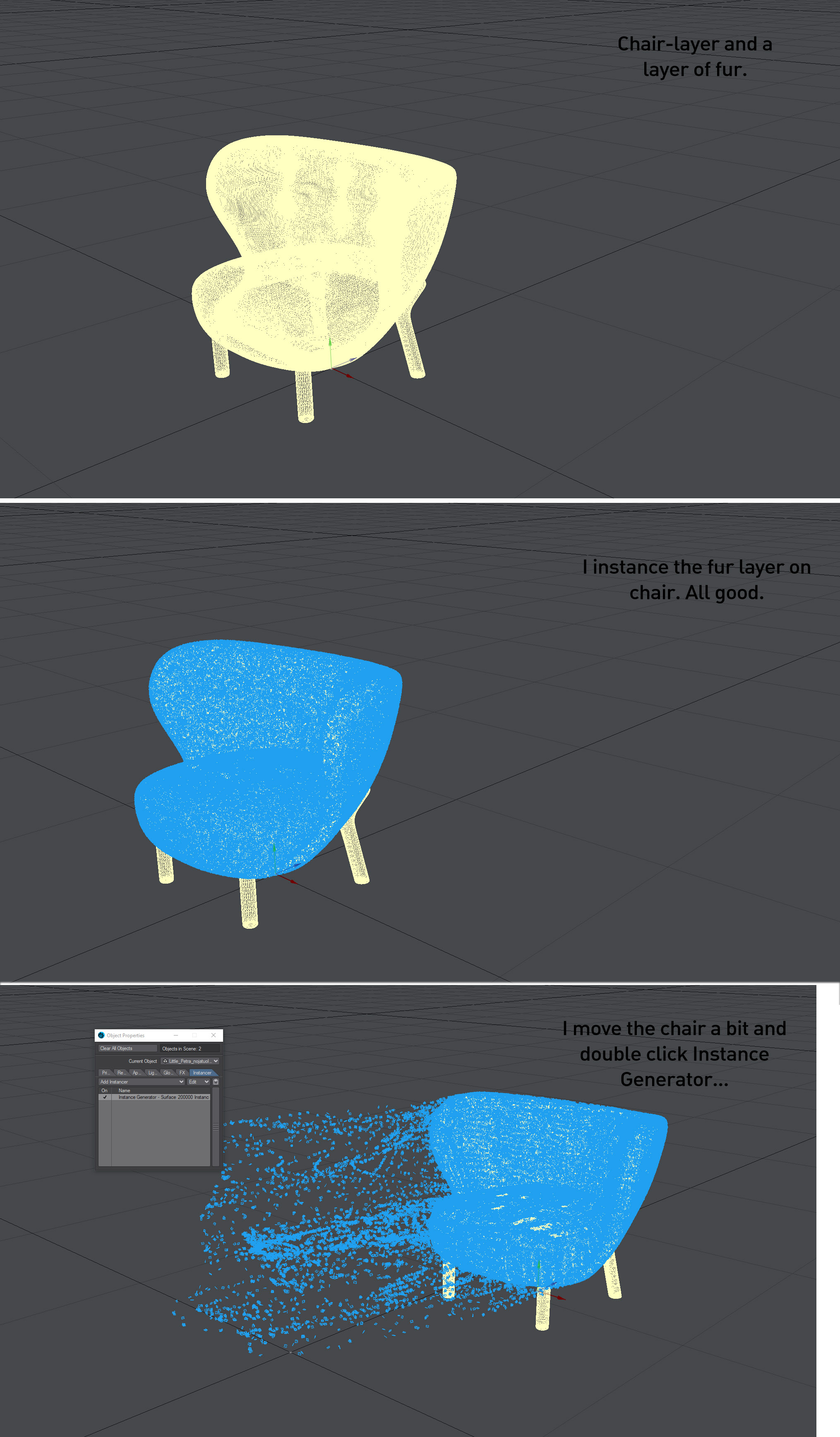 Now with v2023 when I do the same, the Instance Generator doesn´t work. The bushes are set in really weirdly manner, especially if I close and REOPEN Instance Generator. And move the object in between.