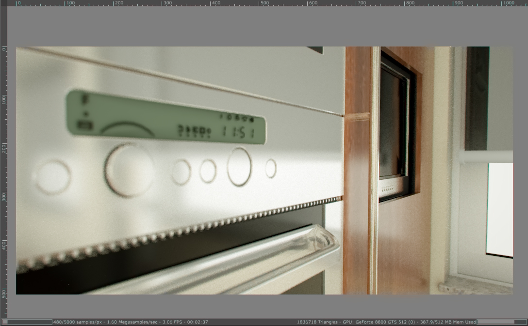 Another interior render, just to see the potential. First image is a directlighting. The interior was done with other renderer for about 2 hour render time and furniture added.