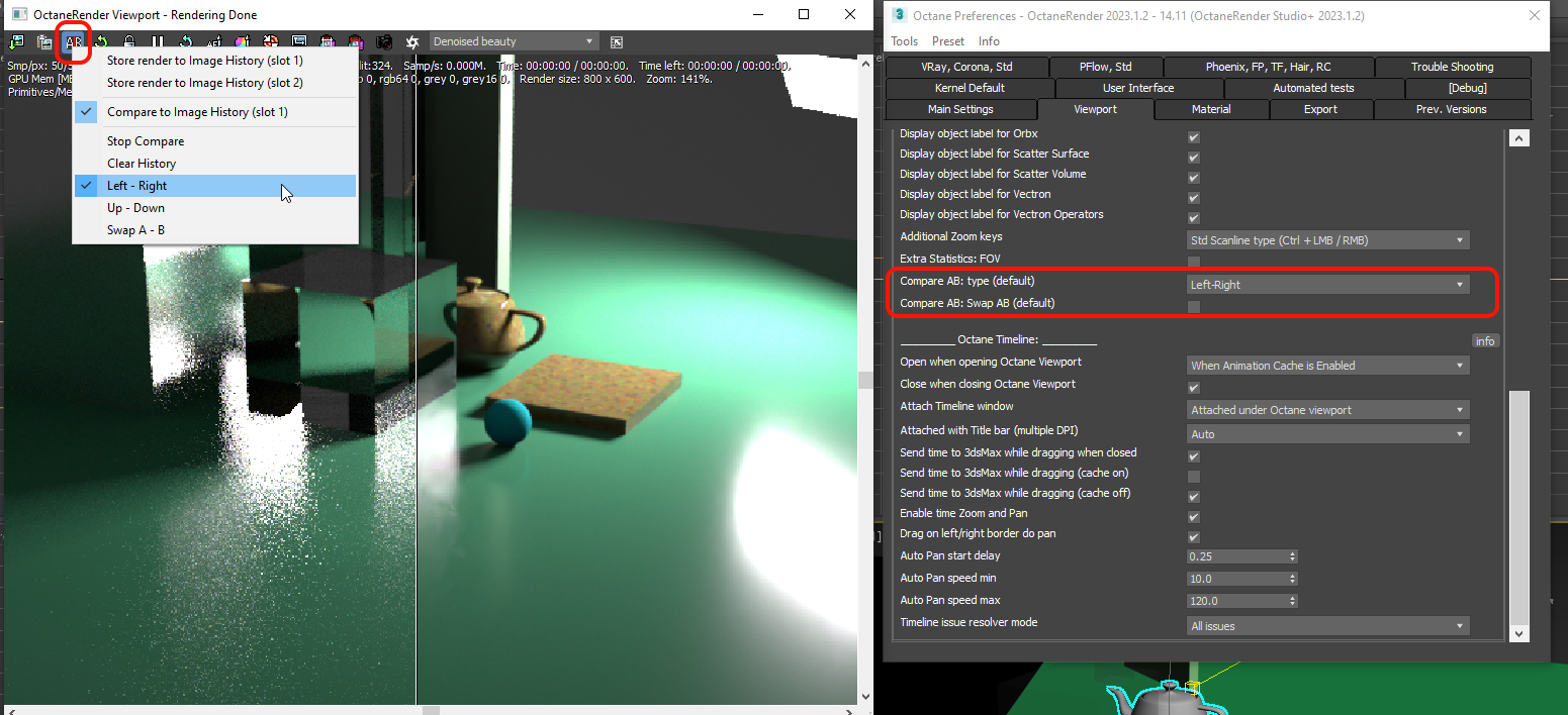The Octane viewport has a new button (A|B) for the rendered image comparator.